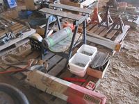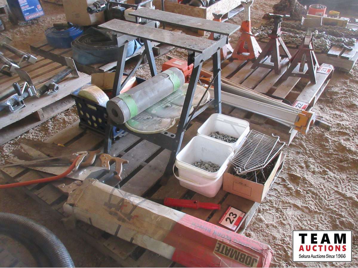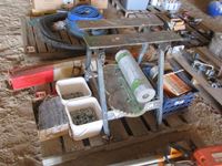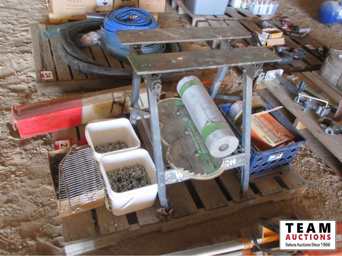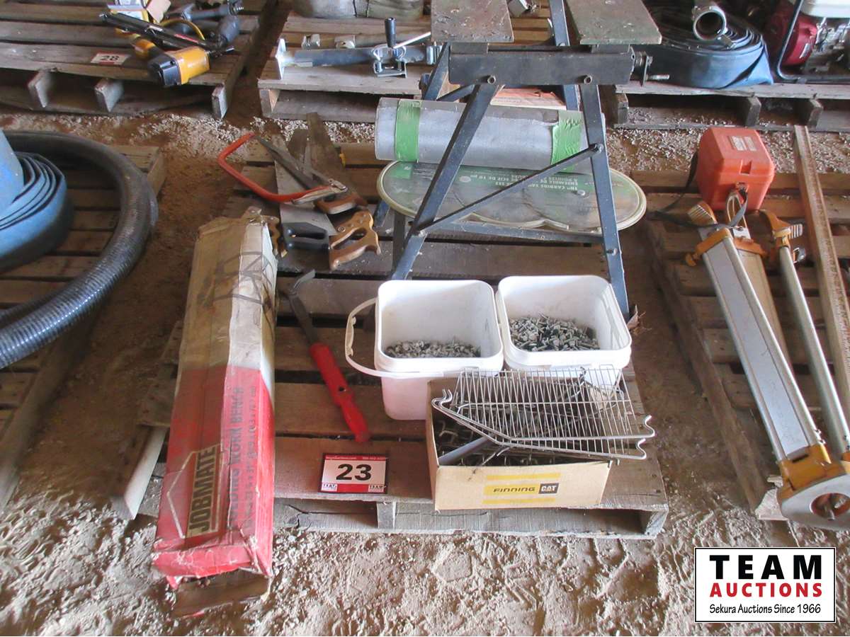 screws, hand saws, (2) work benches, (3) 10" saw blades, part box of floor staples, roll screen, etc