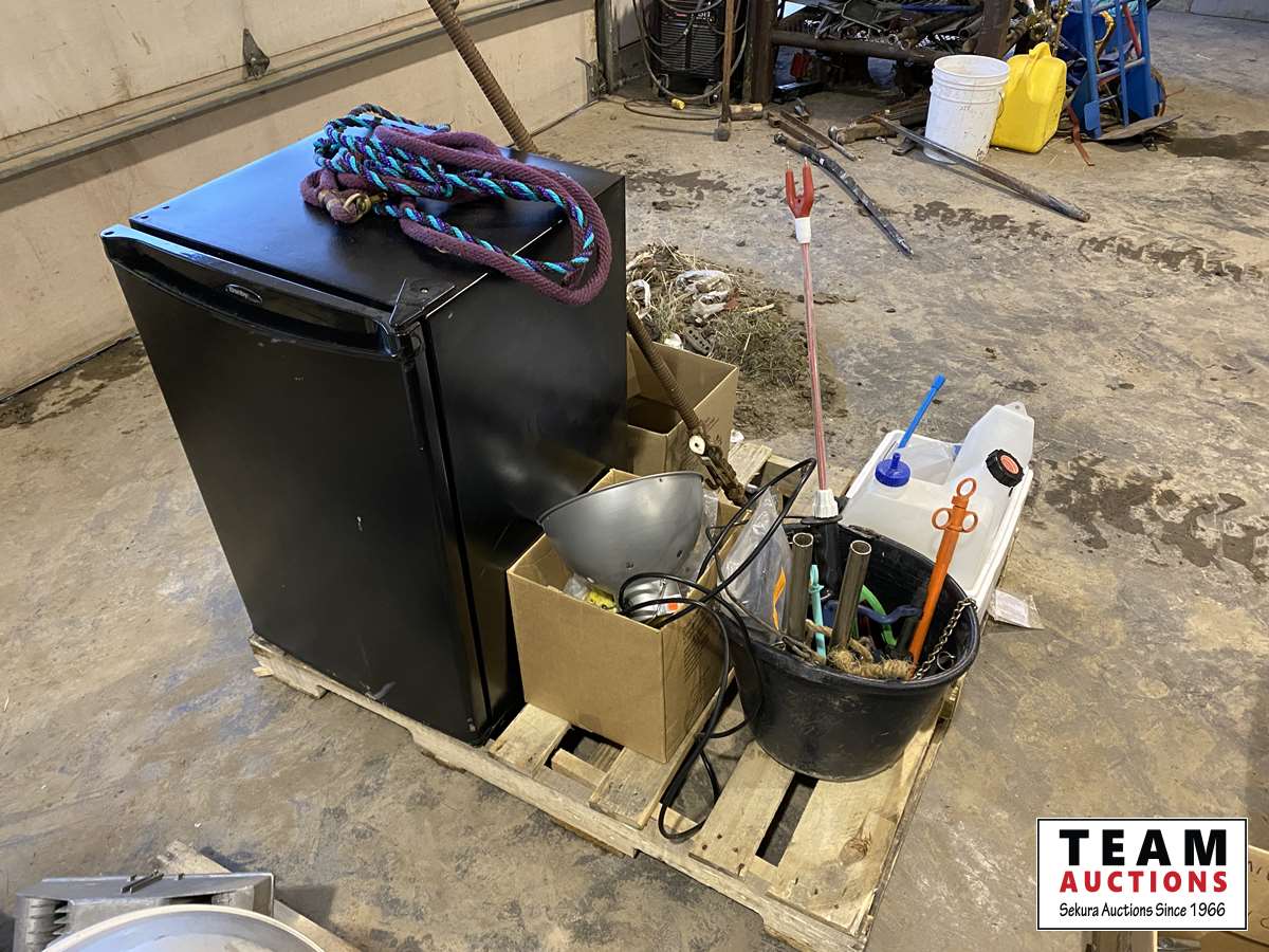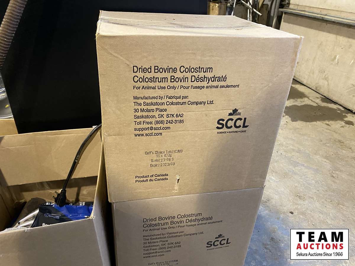 33 bags of Bovine Dried Colostrum, ear tags, cattle prod, tube feeders, cow halters, calf pullers with chains, ear taggers, horn cutters, bottles, heat lamp, fridge