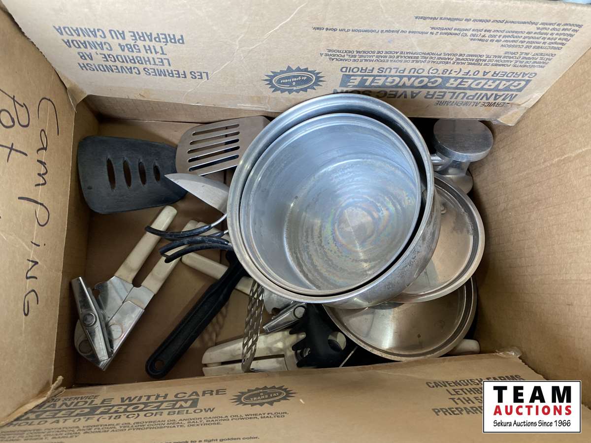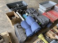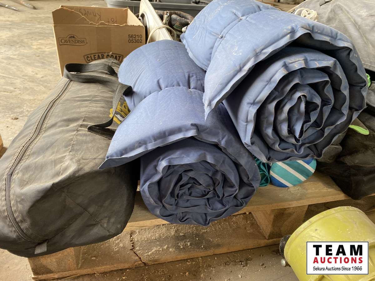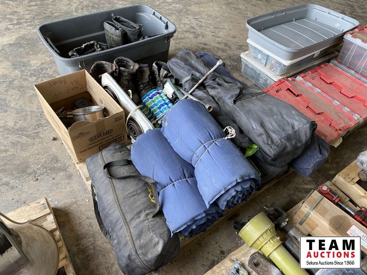 Sleeping mats, cot, hot plate, cooking tools, qty of boots, tire iron
