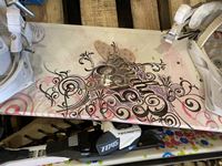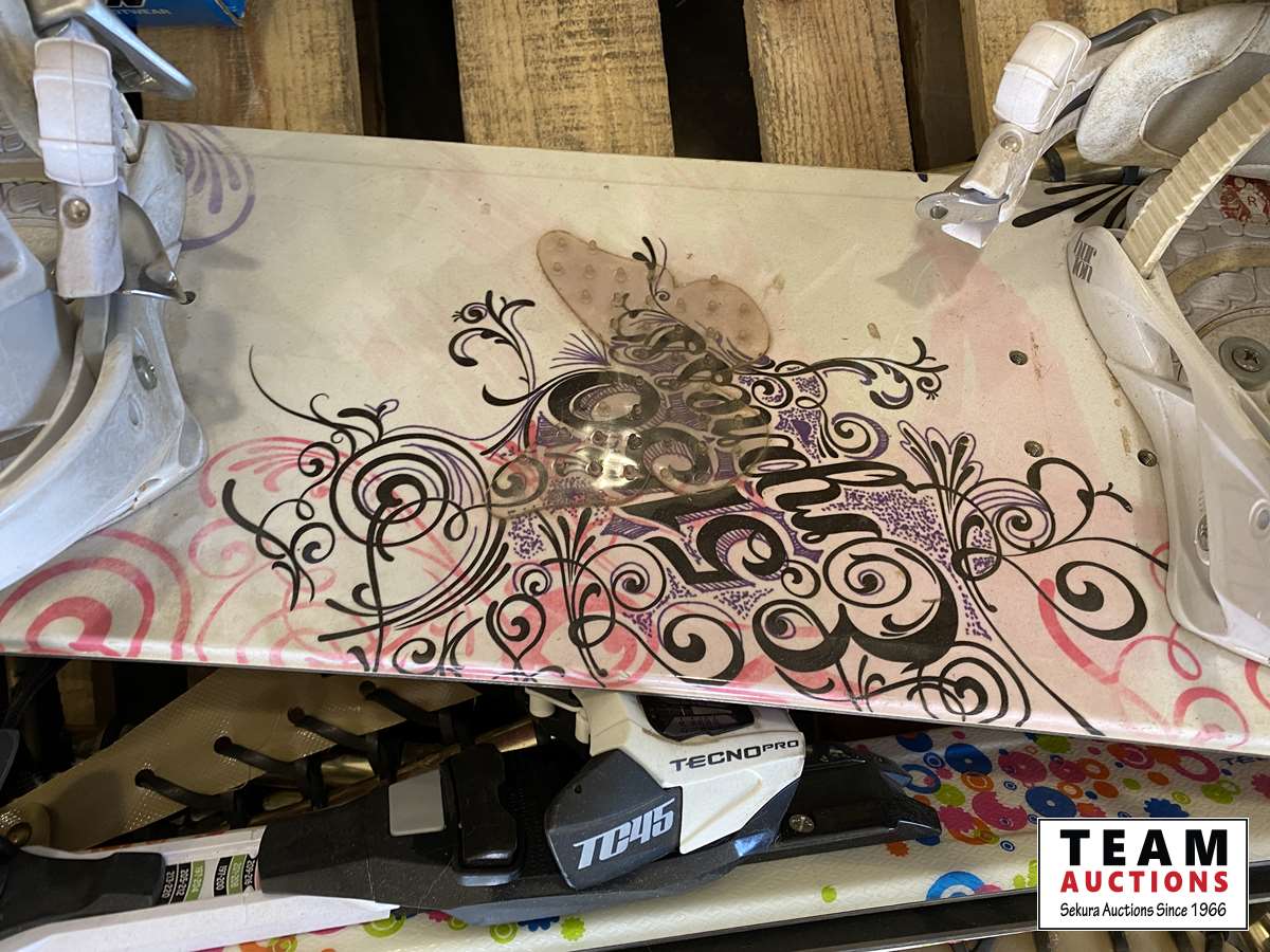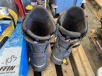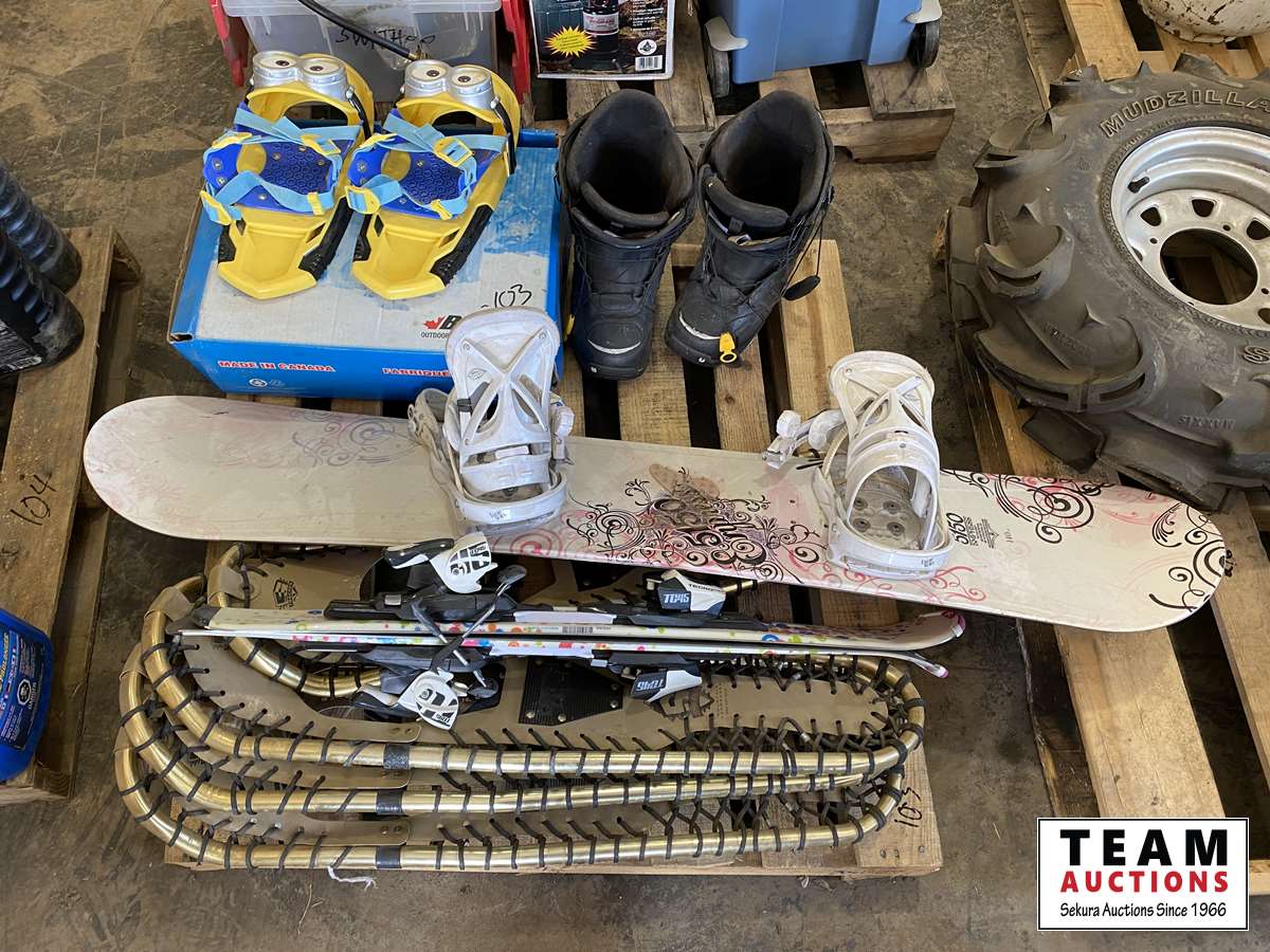 (2) sets of adult snow shoes, Kids snow shoes, Plastic snowboard, Youth snowboard, Mens snowboard boots