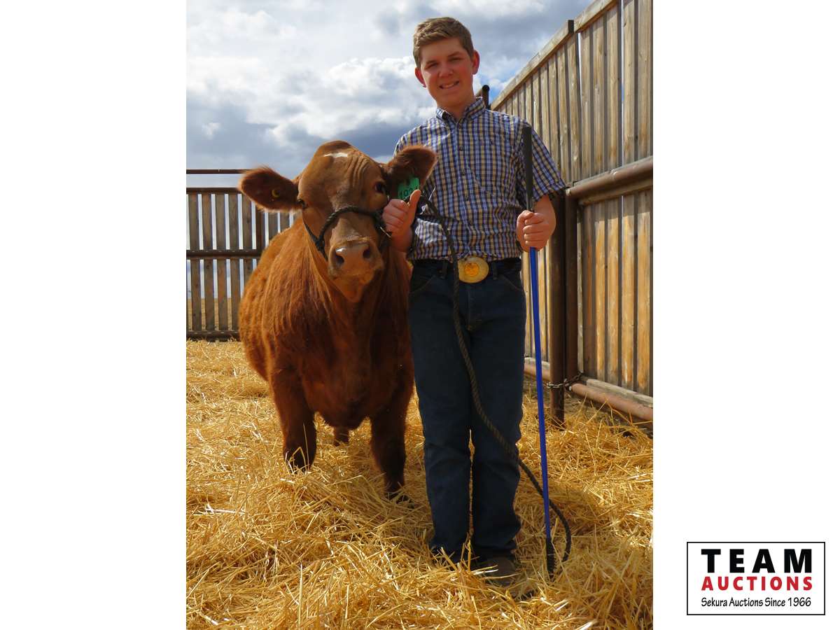 My name is Carter. I am 14 years old and have been in 4-H for 5 years. My interests are driving red equipment and taking things apart which don’t always get back together. My steers name is Gunther. He is a very friendly home raised steer that I picked from one of our herd cows. He likes to give licks and get scratches. I would like to thank my last years buyer Mulchco.