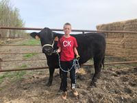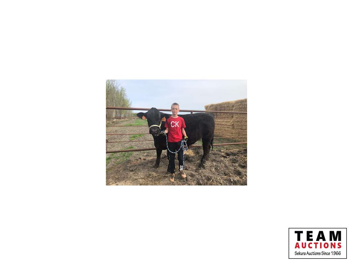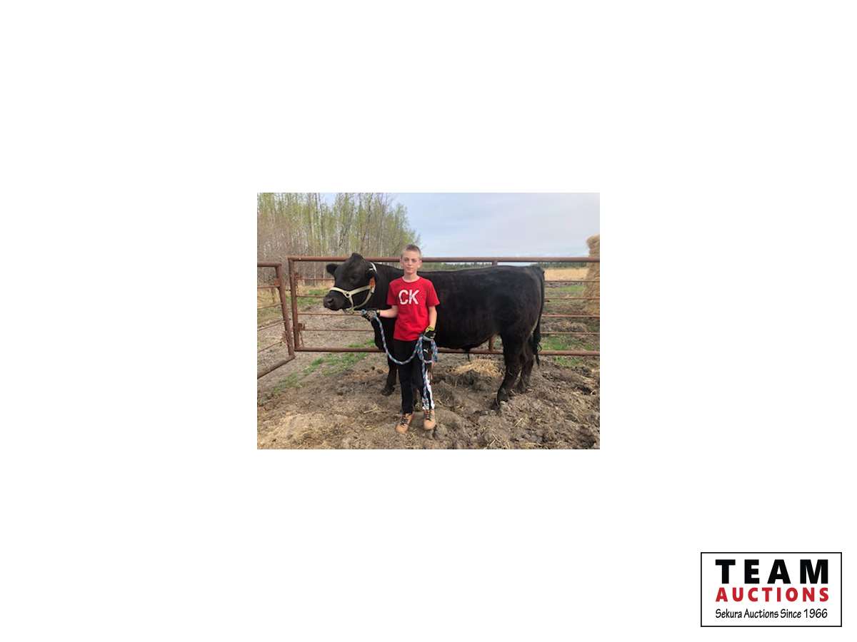 My name is Dustyn Giesbrecht and this is my market steer, Junior. This is my first year in 4H. Junior weighed 640 pounds when we started in November. He's a limo/black angus cross. He likes it when I scratch his neck. He weighed 990 pounds in March.