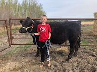 My name is Dustyn Giesbrecht and this is my market steer, Junior. This is my first year in 4H. Junior weighed 640 pounds when we started in November. He's a limo/black angus cross. He likes it when I scratch his neck. He weighed 990 pounds in March.