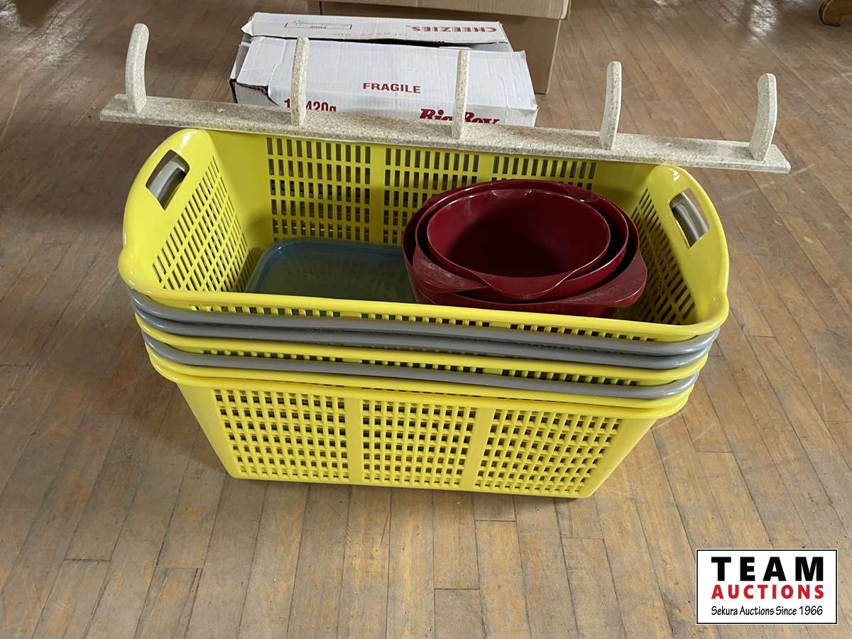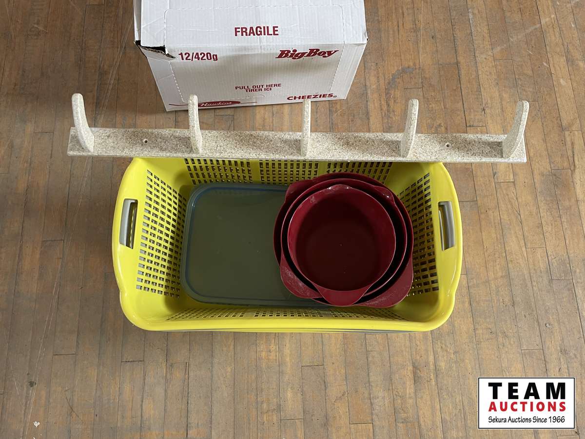 1082 (7) Baskets, (4) Mixing Bowels, Wall Mount Coat Hangers