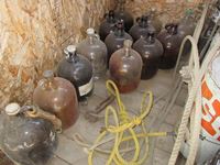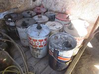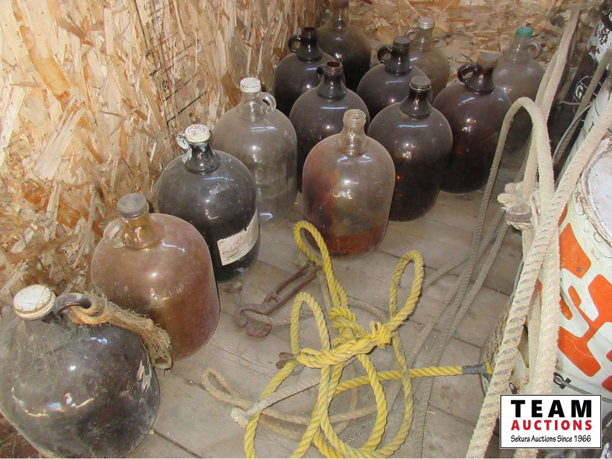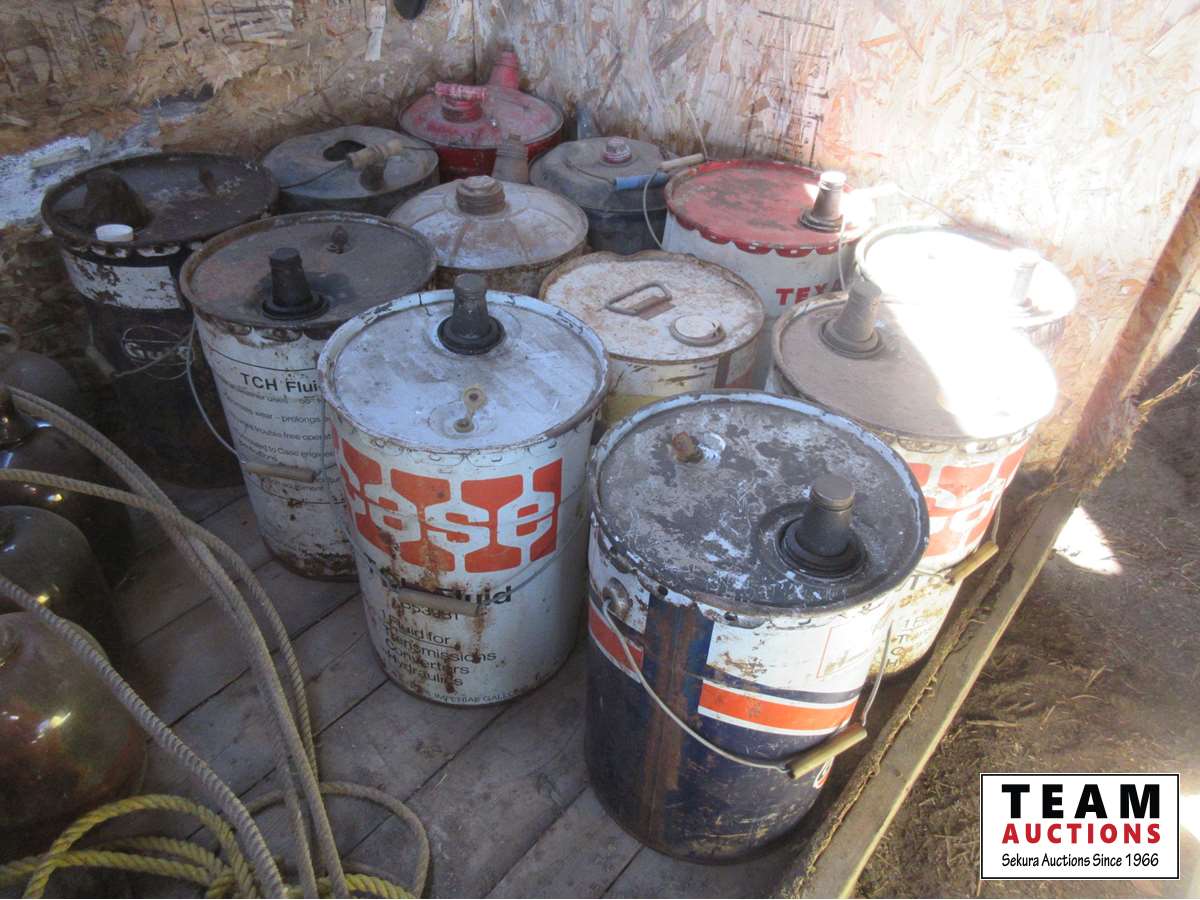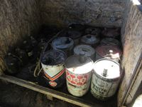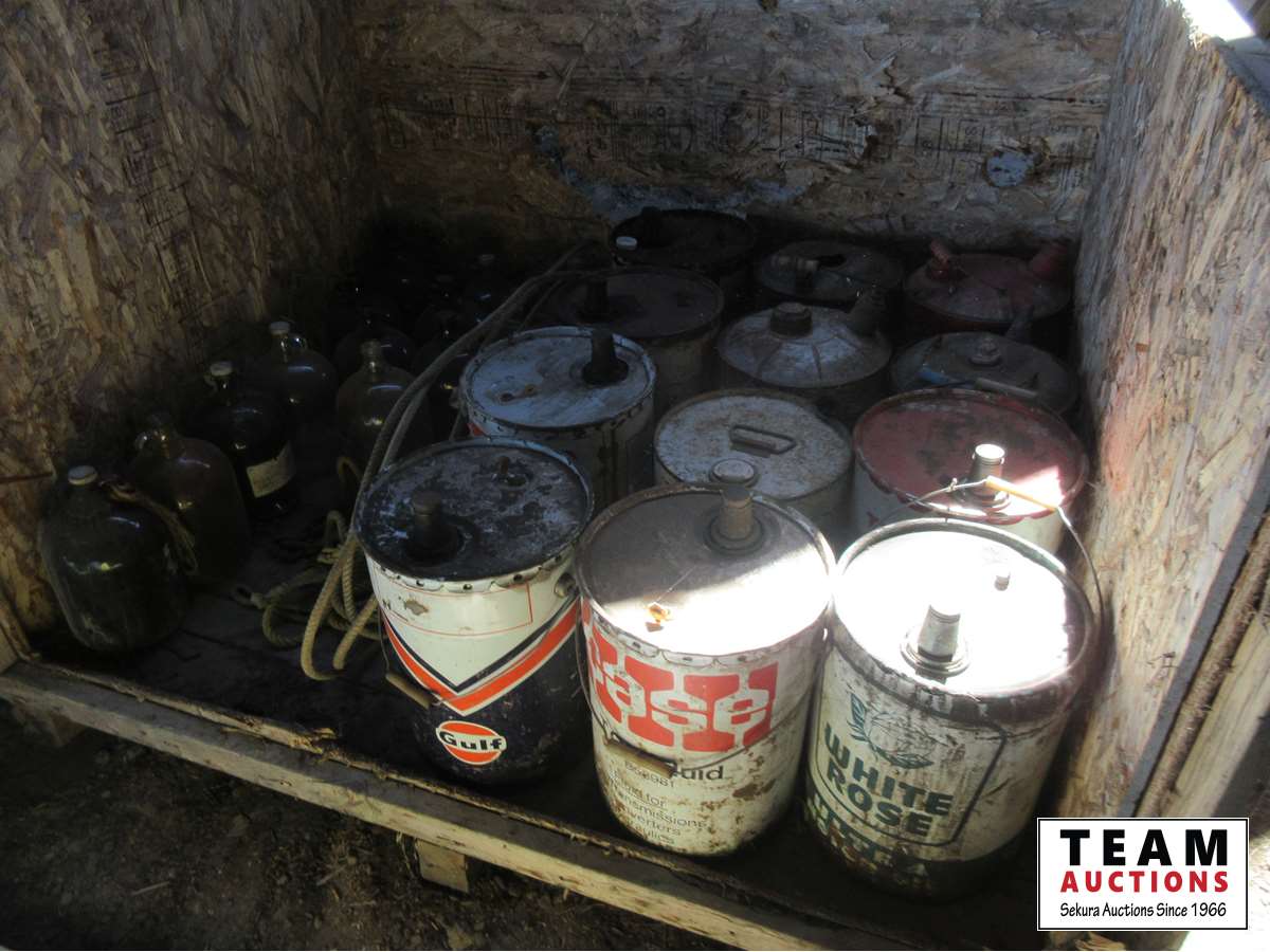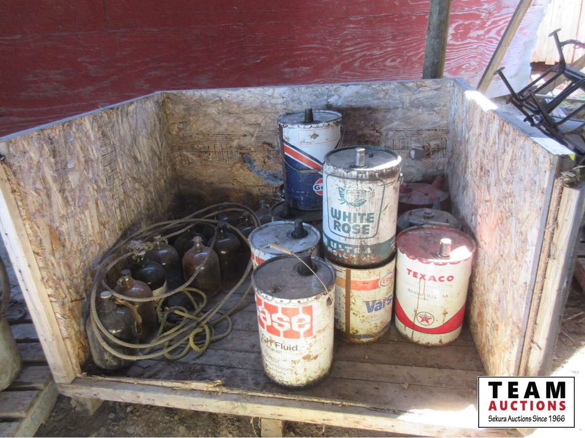 Assortment of 1 gal glass jugs, jerry cans, Gulf pail, White Rose pail, Texaco pail, miscellaneous metal pails
