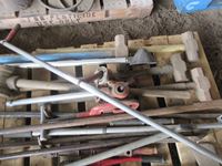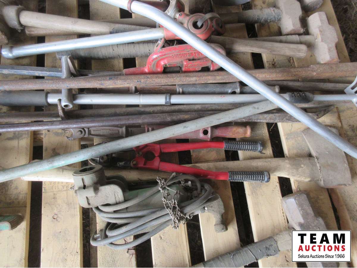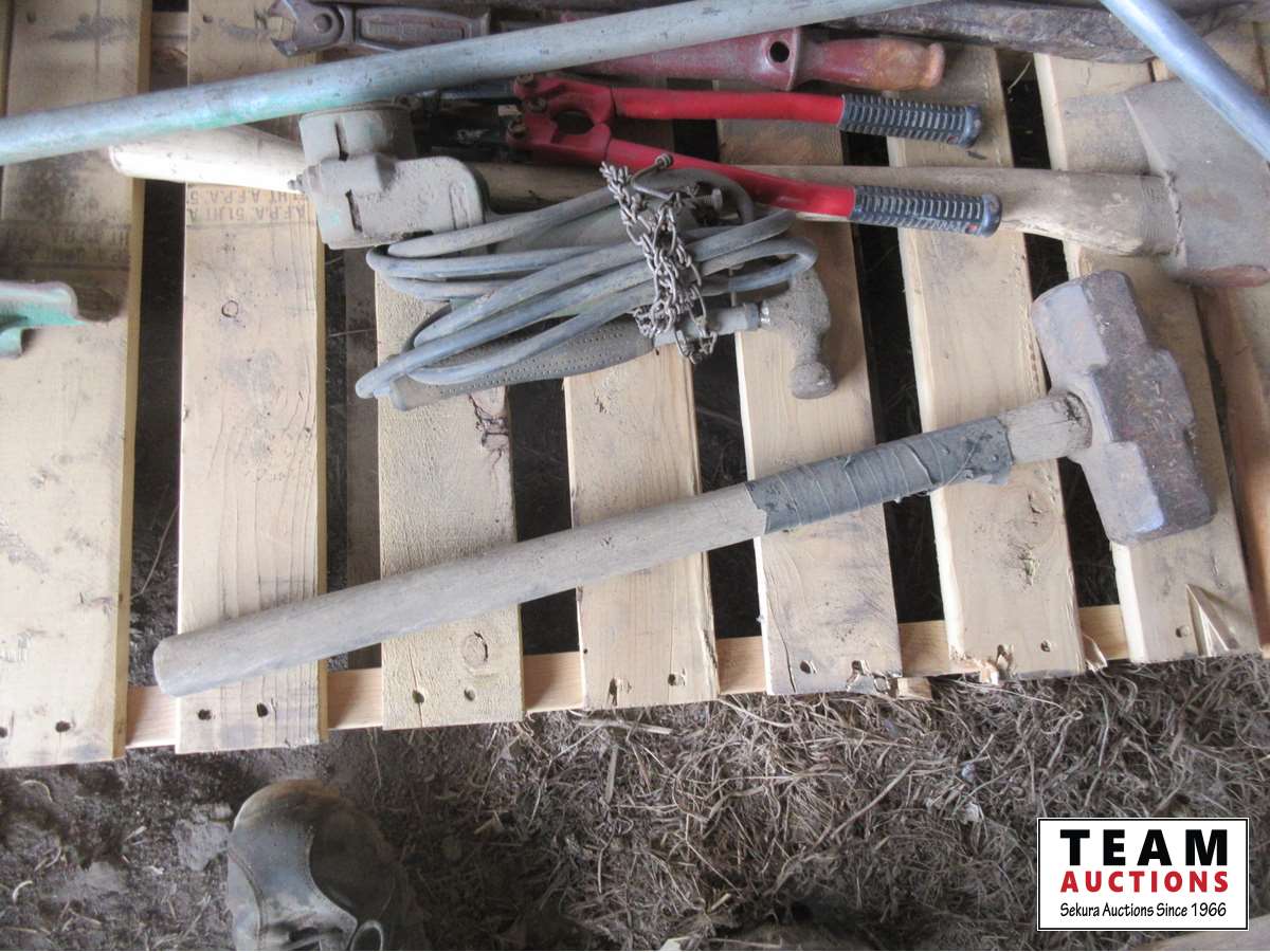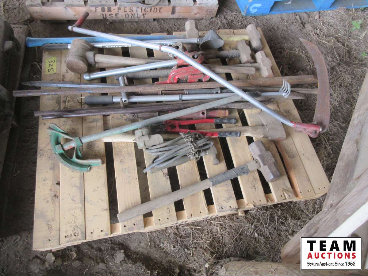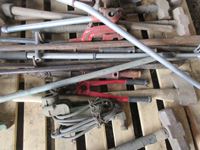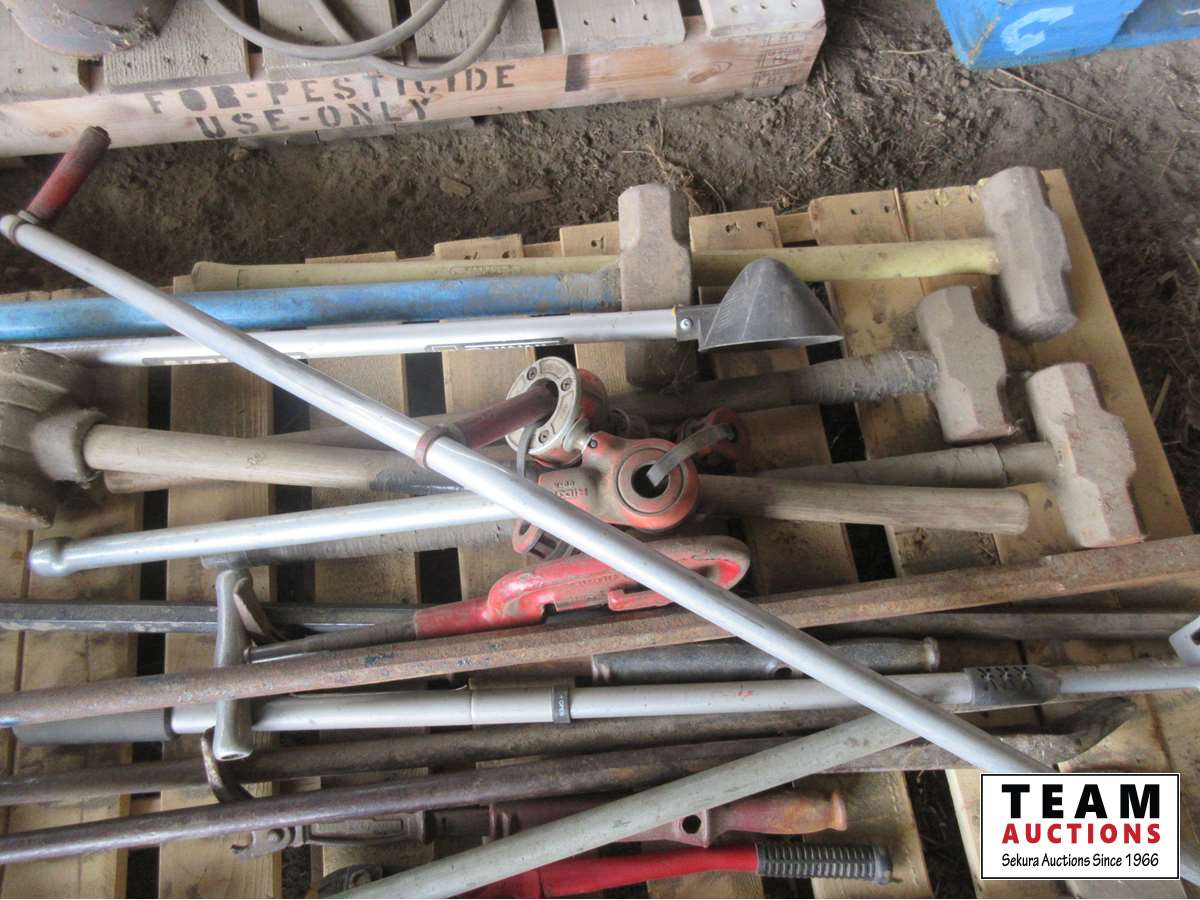 Sledge hammers, post maul, JD PTO air compressor, pipe threaders, bolt cutters, crow bar, axe