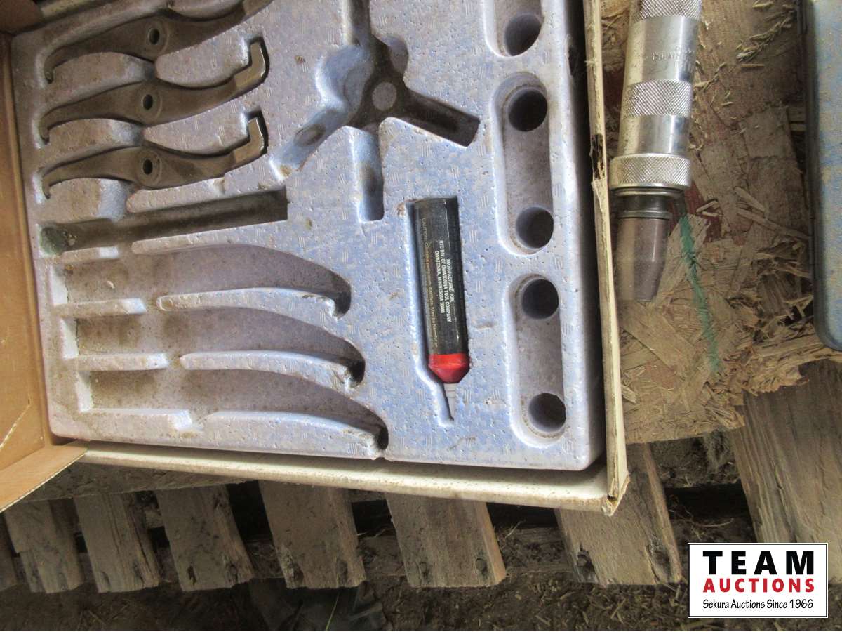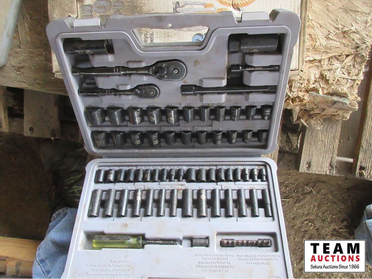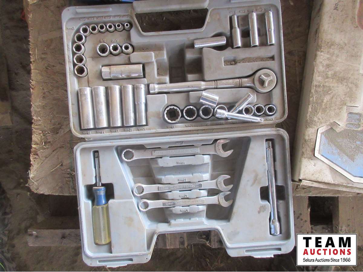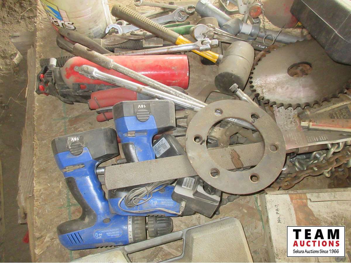 Fire Extinguisher, Stanley socket set, rubber mallet, Craftsman socket set, 18V drills, miscellaneous