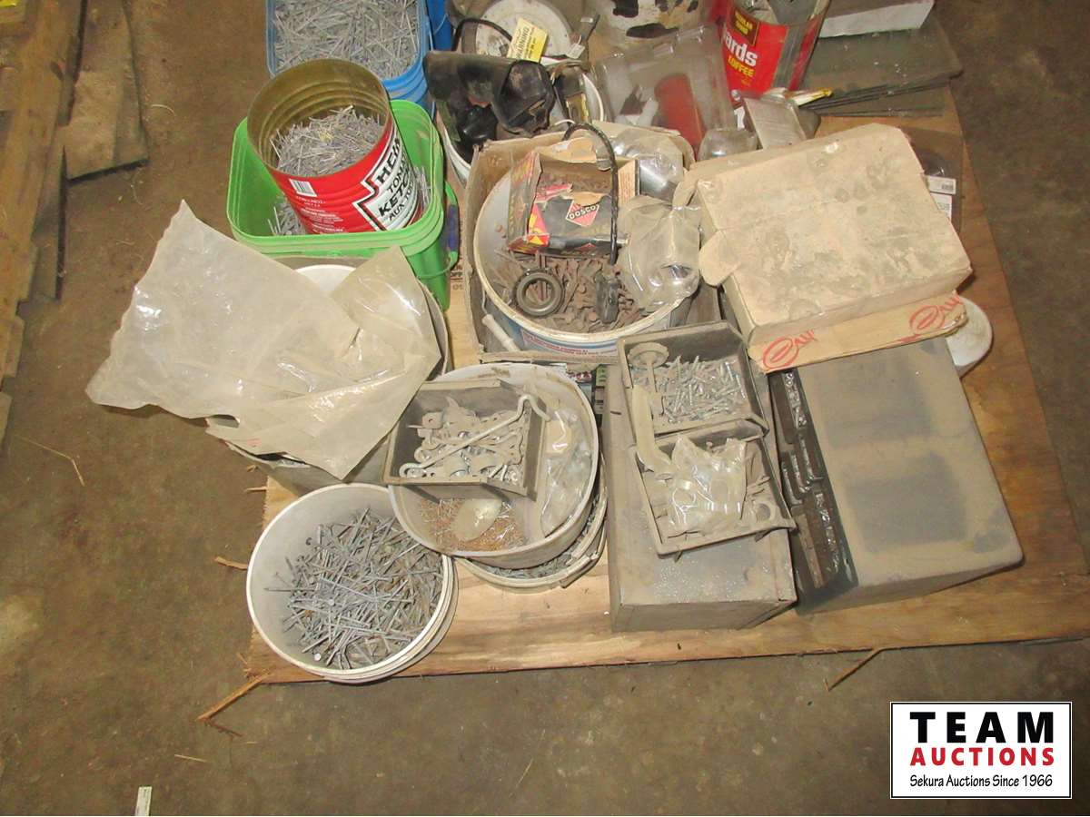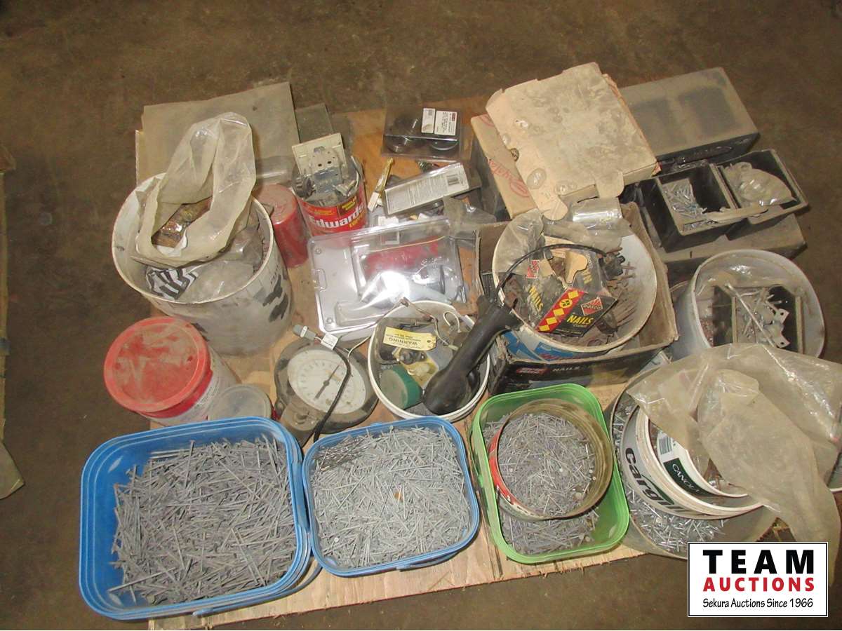 Buckets of nails, 18V DeWalt drill with charger, qty of miscellaneous hardware