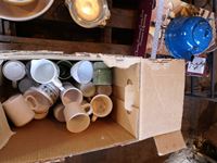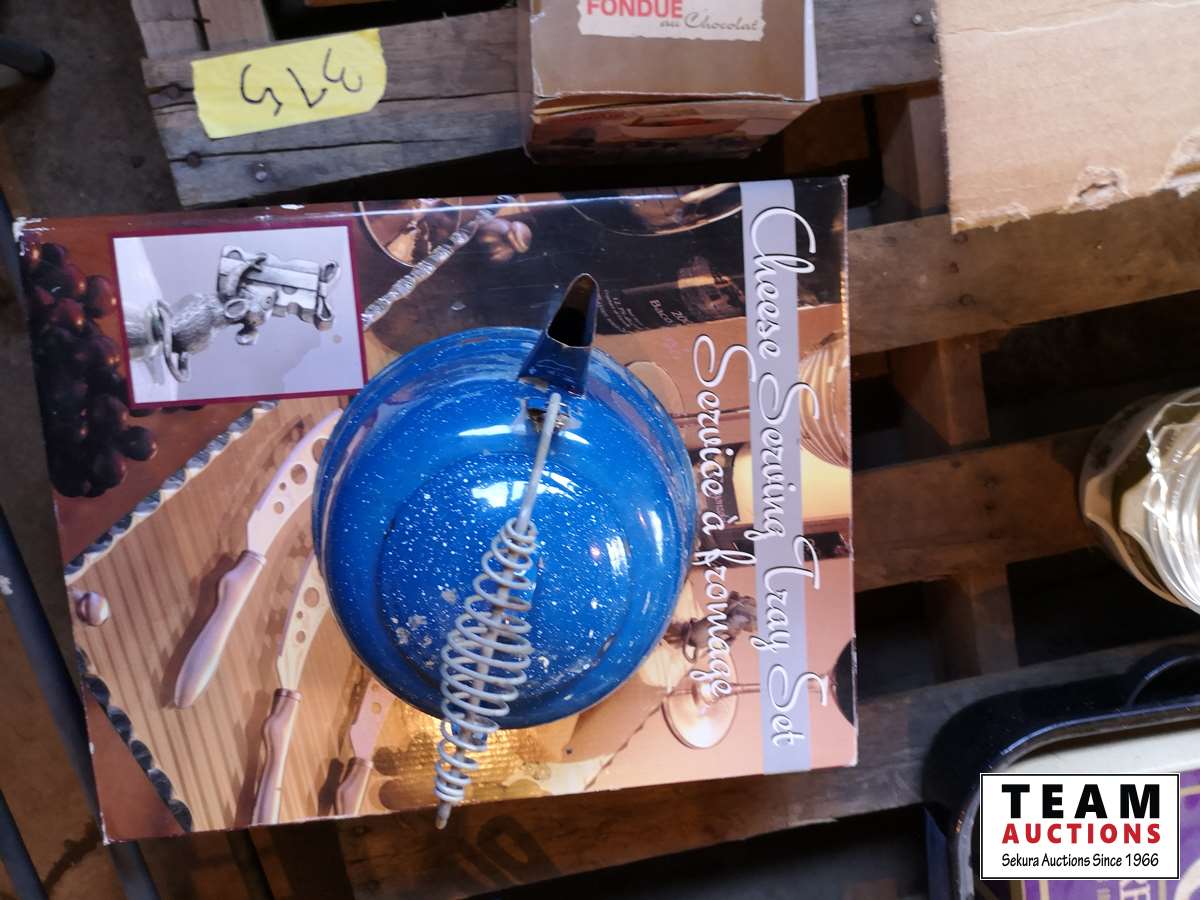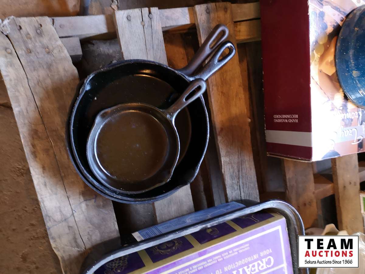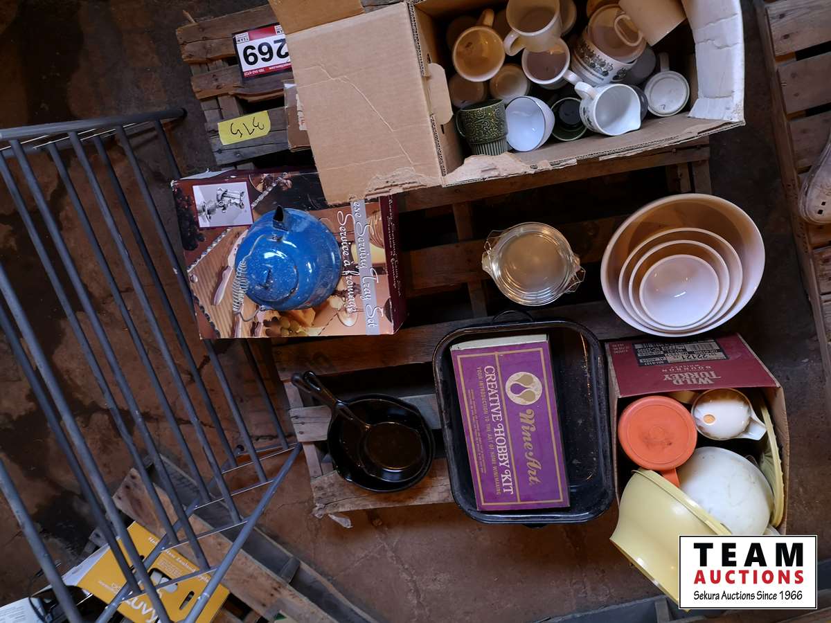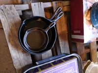 Cast iron frying pans, bowls, cups, cheese serving tray, kettle, shoe rack, fondue set, miscellaneous household