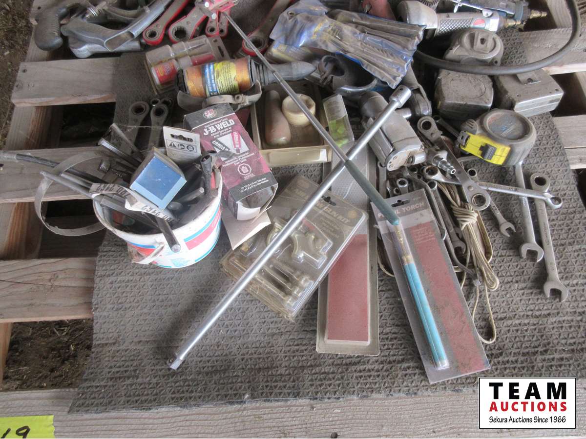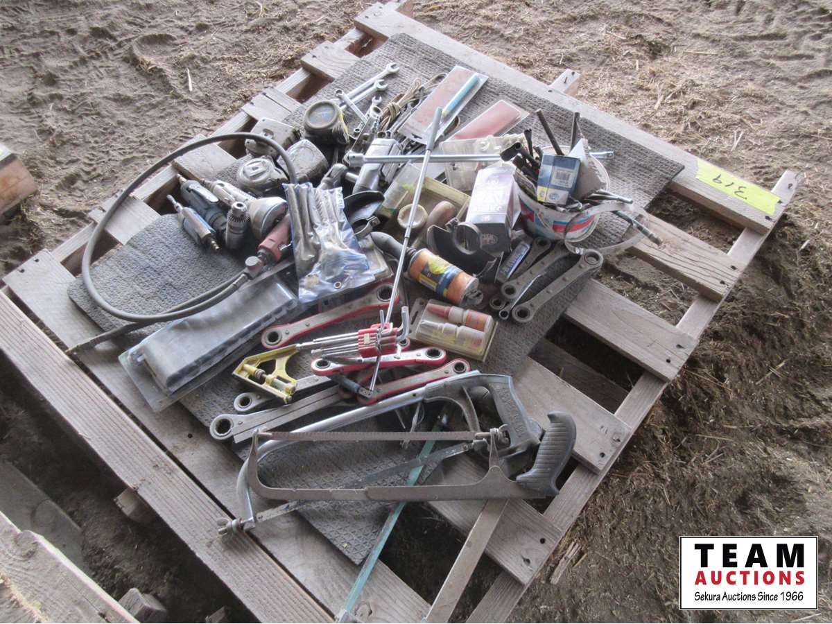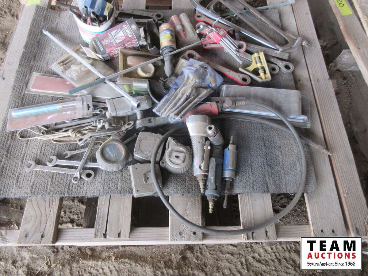 Air ratchet, air cut off tool, die grinders, air chucks, spool of string, box end wrenches, hacksaws, miscellaneous