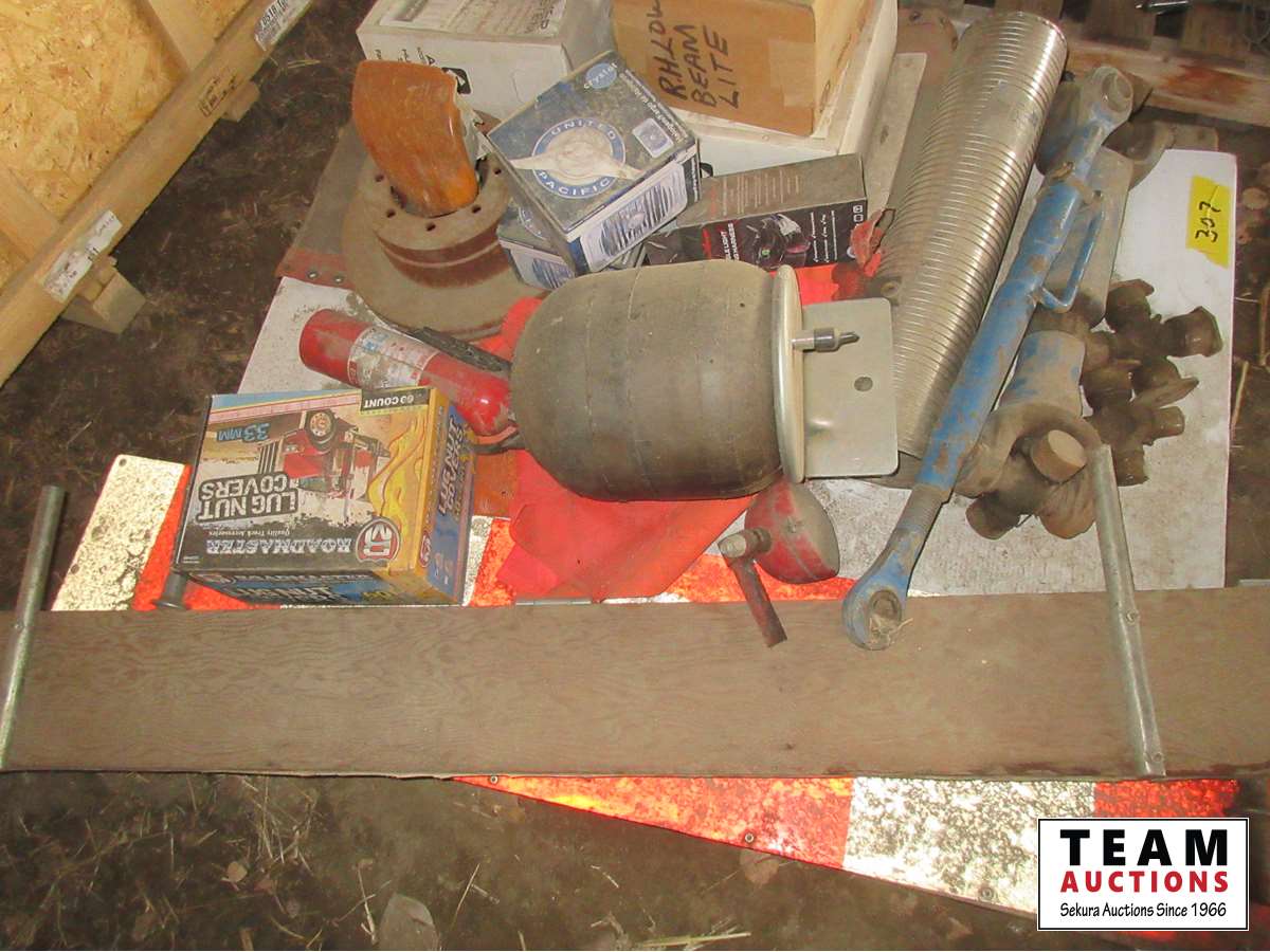 Air bag, flex hose, wide load sign, red marker flags, heavy driveshaft, chrome lug covers, lights, 3 point top link, miscellaneous parts