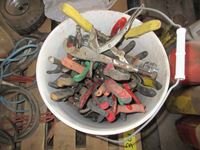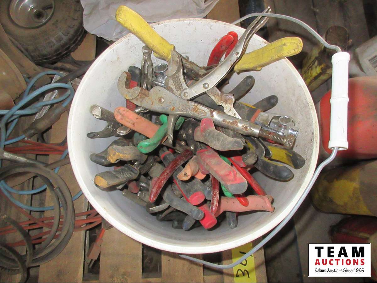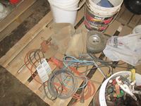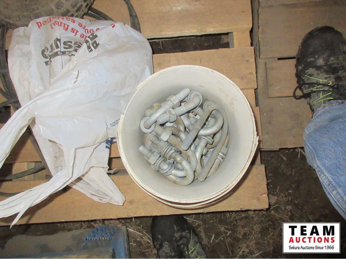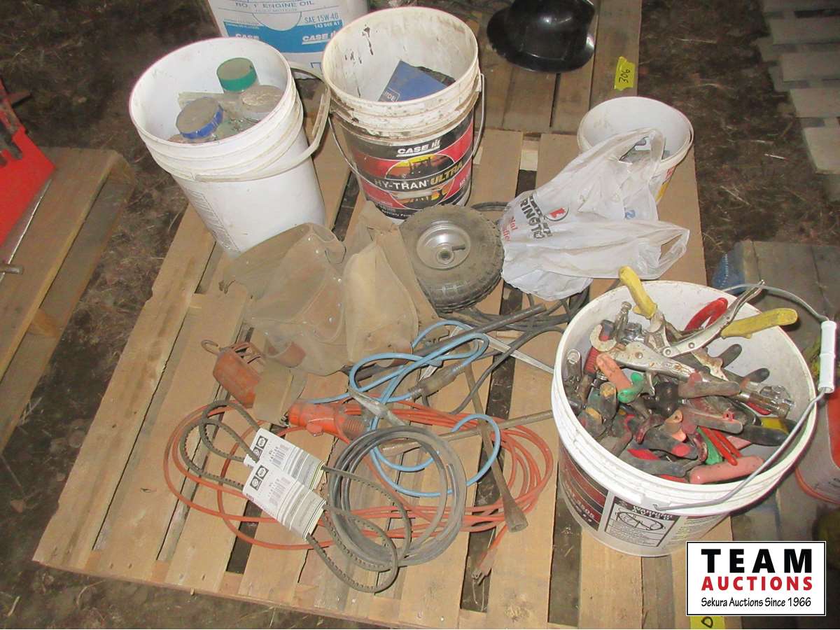 Bucket full of hand tools, trouble light, (2) carpenters belts, Hardware, wheelbarrow wheel, U bolts, guards for Case IH swather