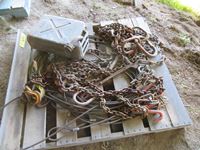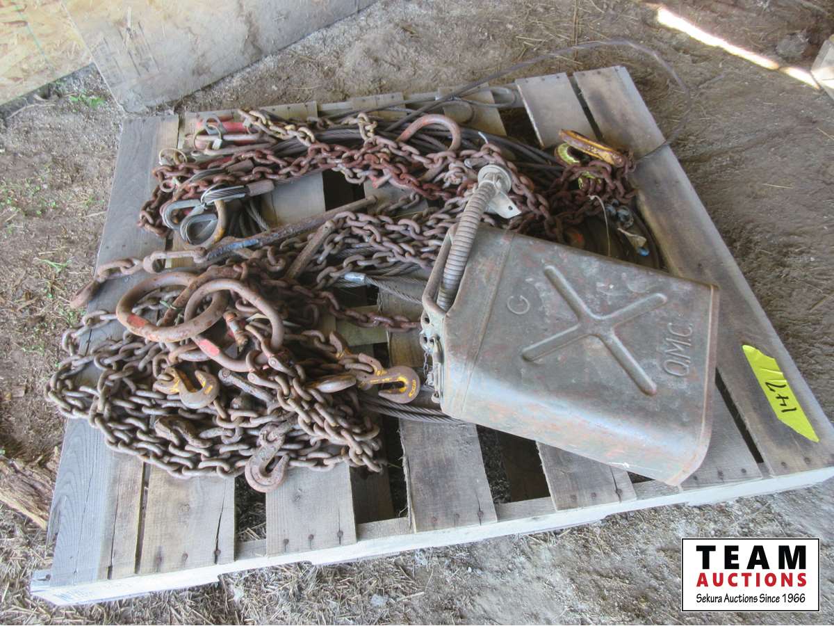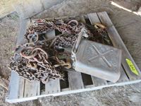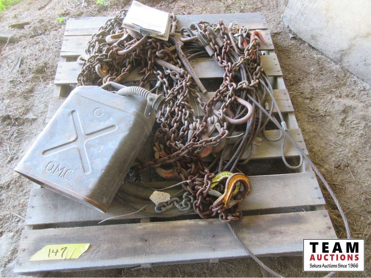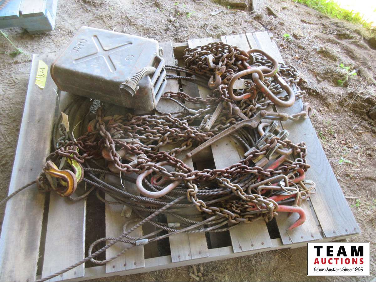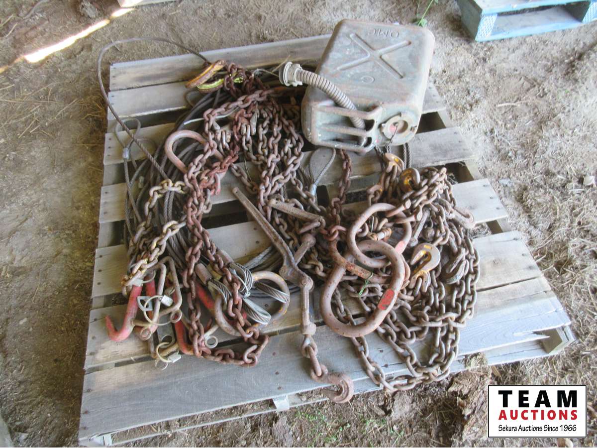 Metal Jerry can, (2) lever load binders, cable & chain slings,