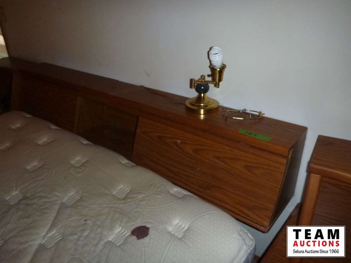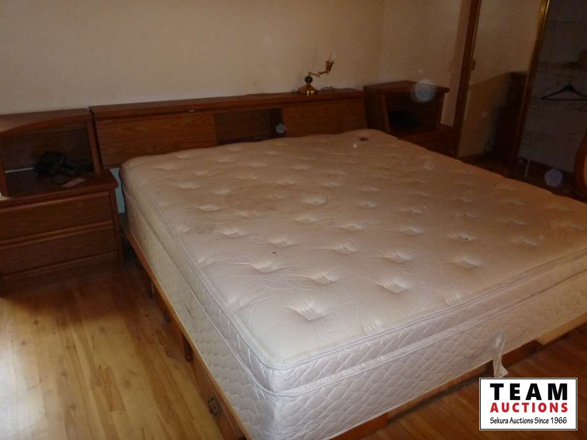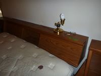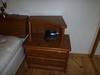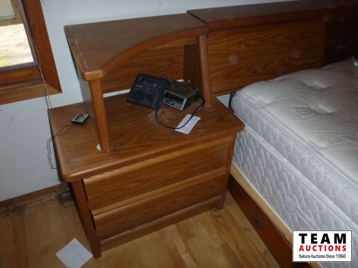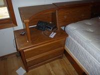 Bed, (2) side tables, tall boy, dresser