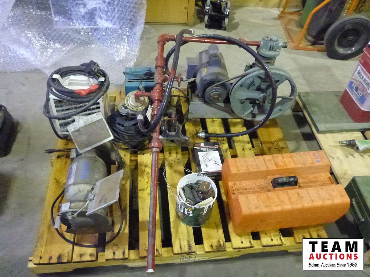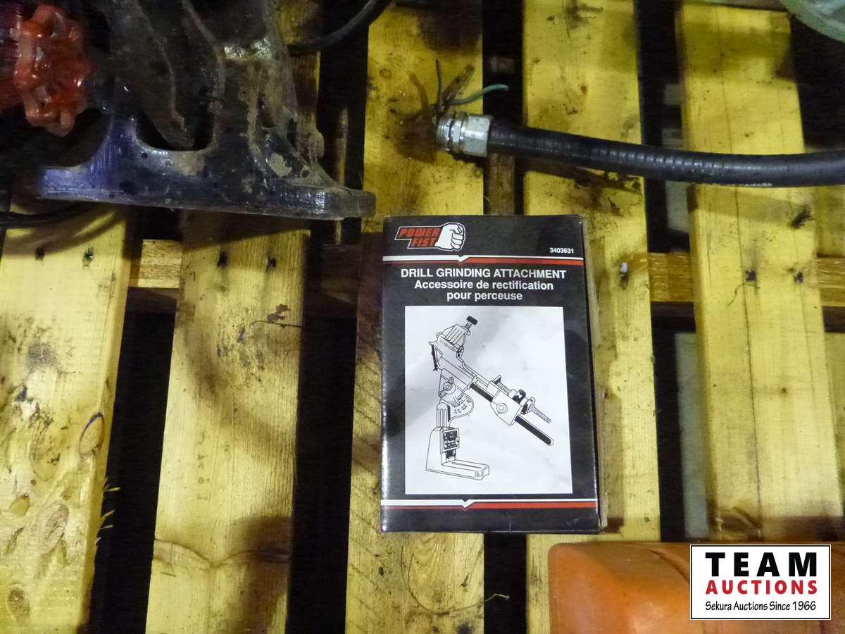Drill bit sharpener, small air compressor, 220V Construction heater, bolt on pintle hitch, 6 inch bench grinder, B&D Work Wheel