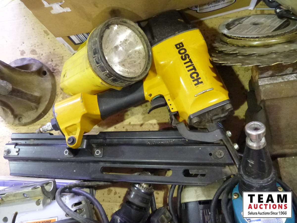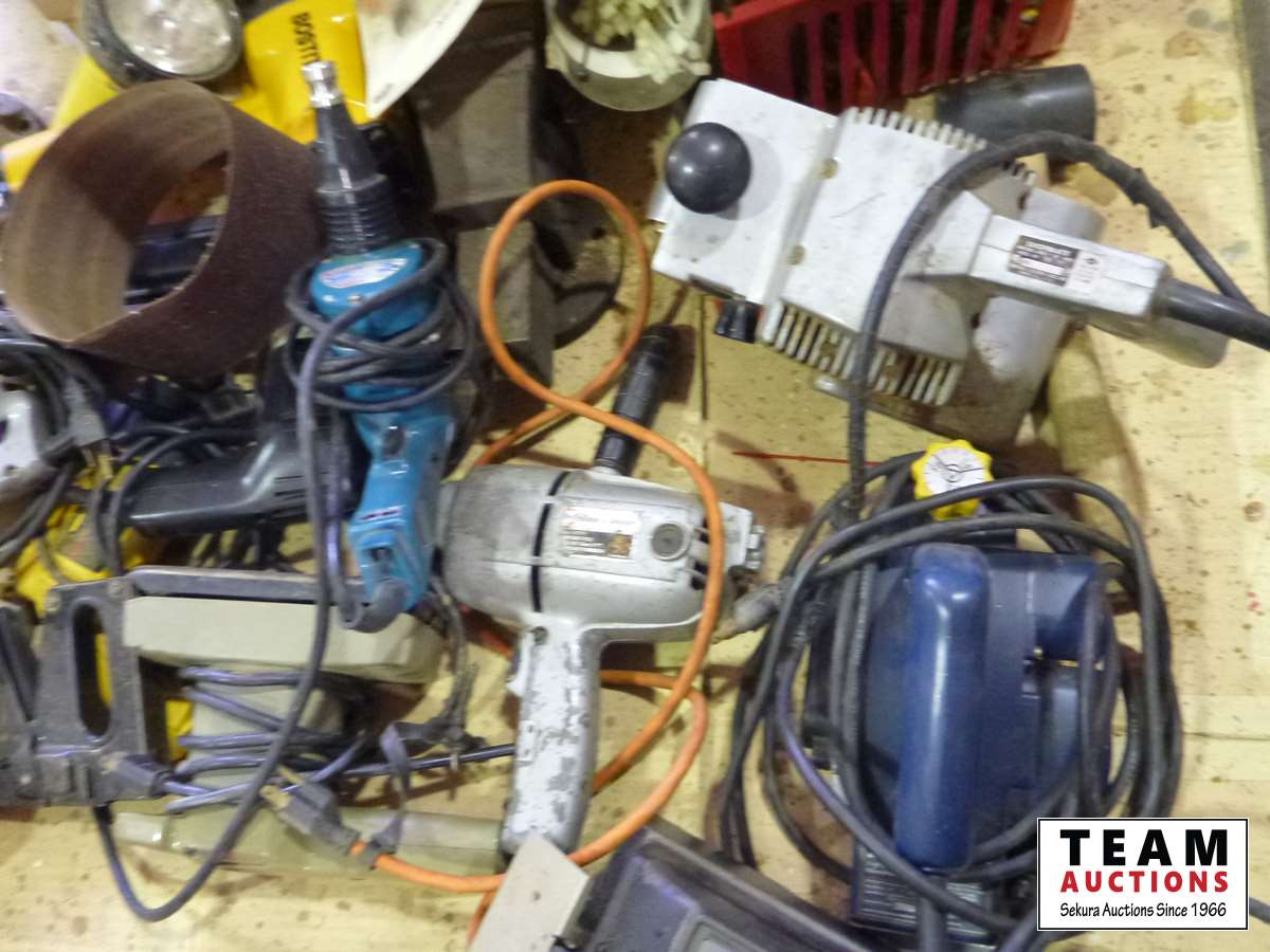 Corded drills, jigsaw, belt sanders, knife sharpener, autobody tool kit, air sander, cable cutter, (2) long measuring tapes, drywall screw gun, miscellaneous tools and hardware