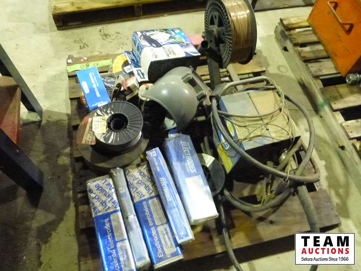 Millermatic S32S wire feed welder, welding rods, mig wire, face shield, (21) welding helmets, miscellaneous