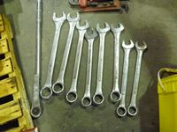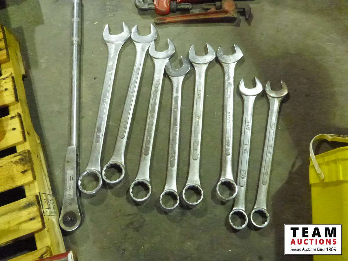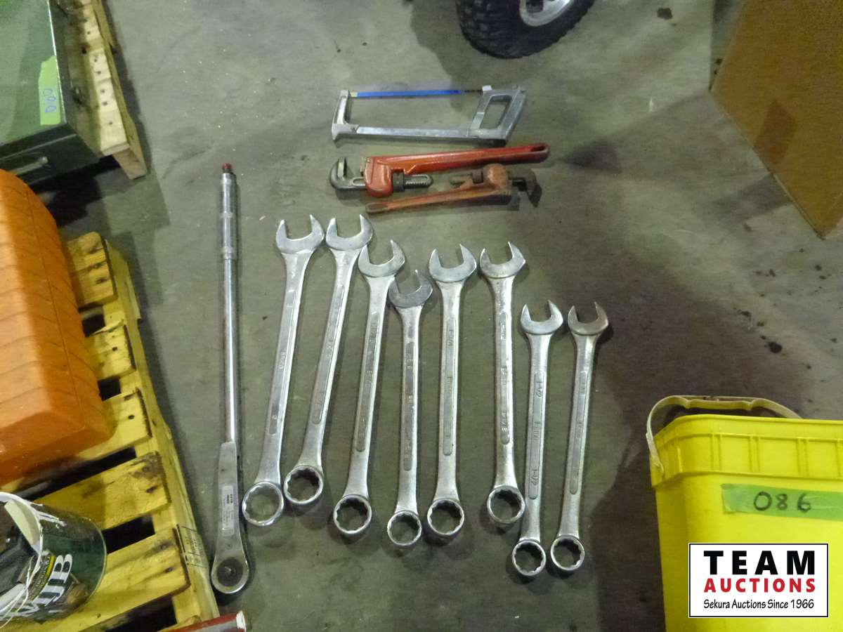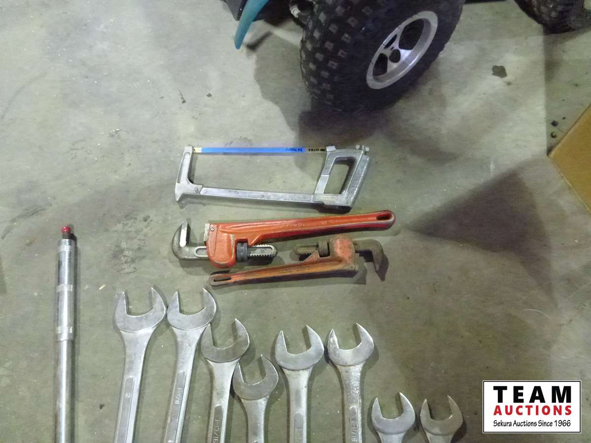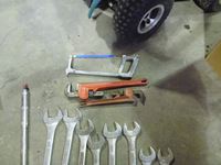 Large combination wrench set, (2) pipe wrenches, hack saw