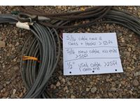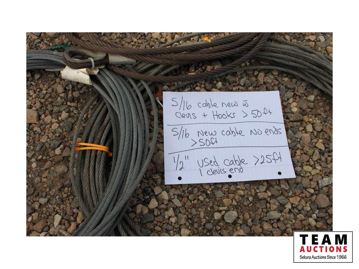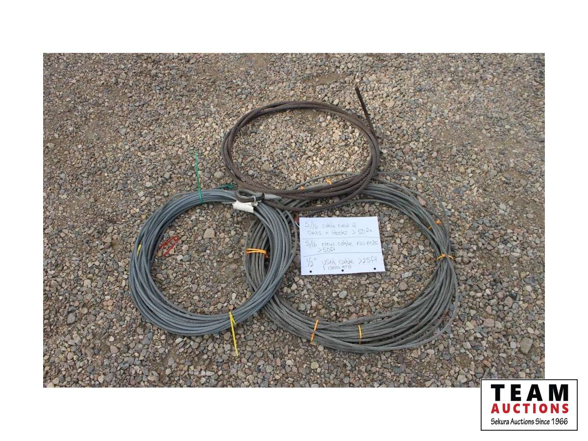 (1) new 3/8 inch X 50 ft with clevis and hook, (1) new 3/8 inch cable no ends, (1) used 1/2 inch cable one clevis end