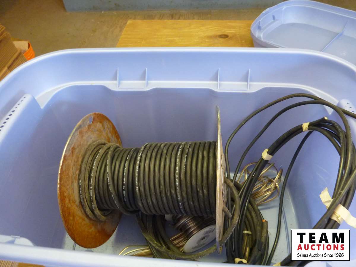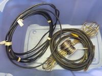 Carpentry wood tool box, tool belt, new extension cord wire miscellaneous cable, tote, breaker panel no door