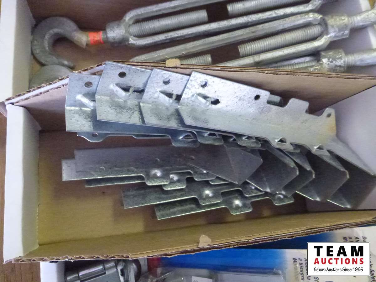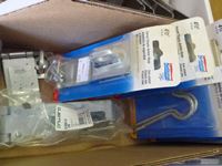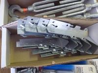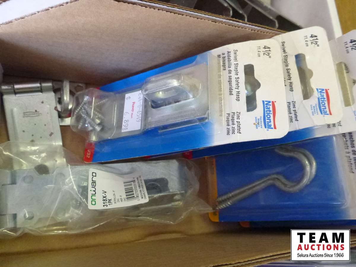 Folding supports, latches, hinge & handle packages, swivel safety hasp, lock hasps, joist hangers