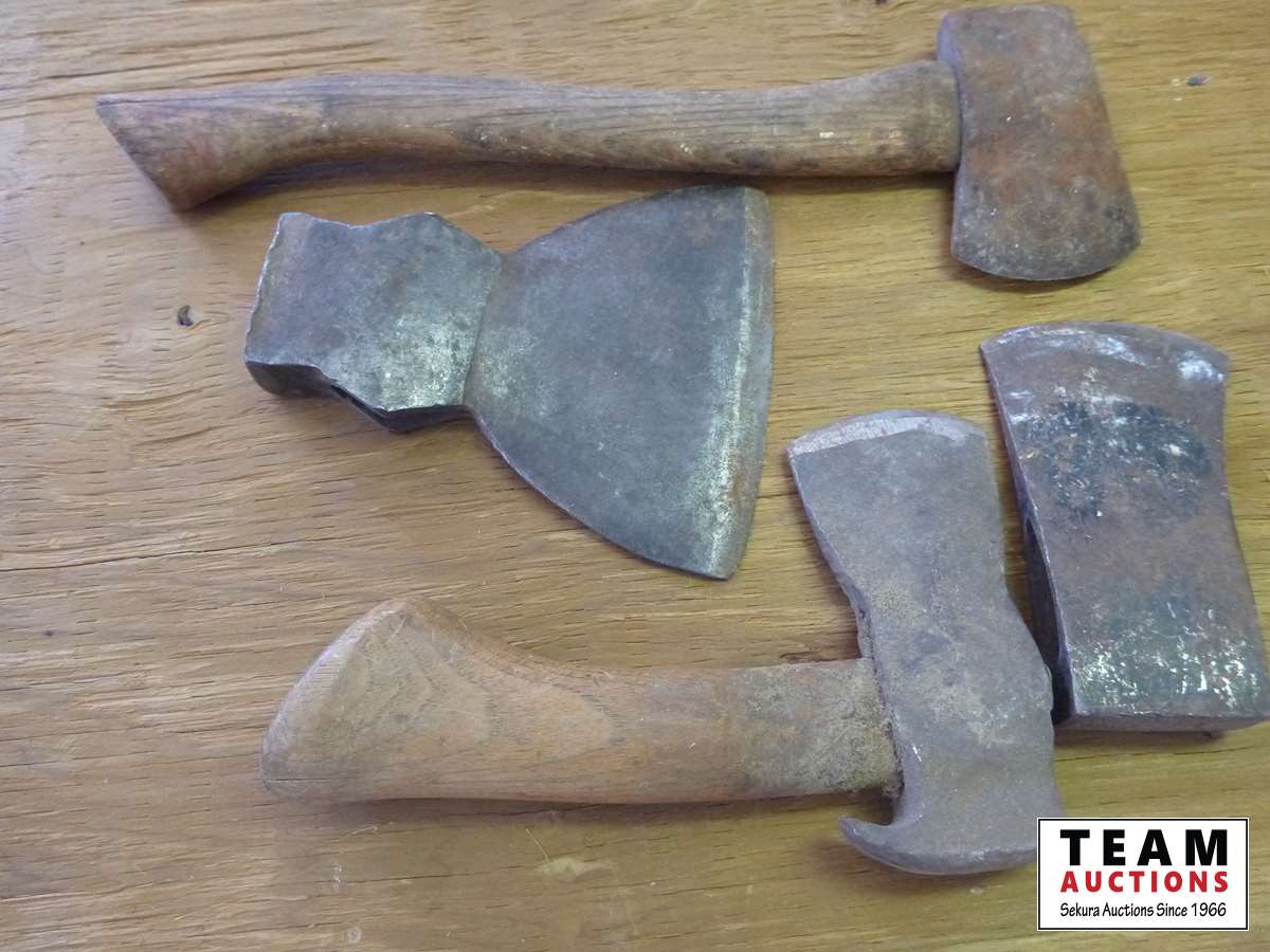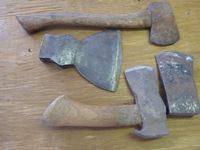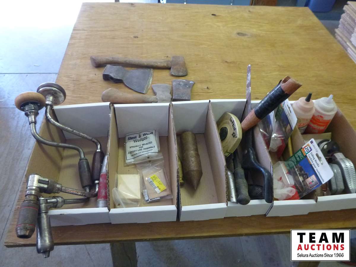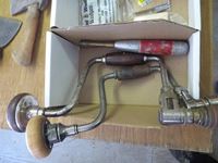 Drill braces, hand drill screw driver, hatchet, axe heads, chalk lines, chalk, plumb bob, sliding hooks, nail remover, saw