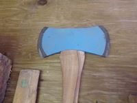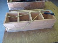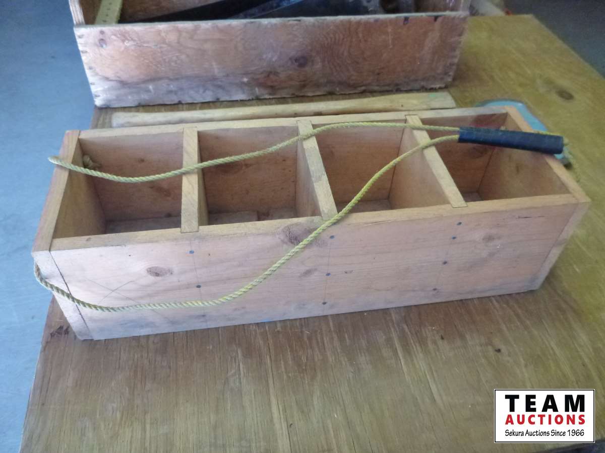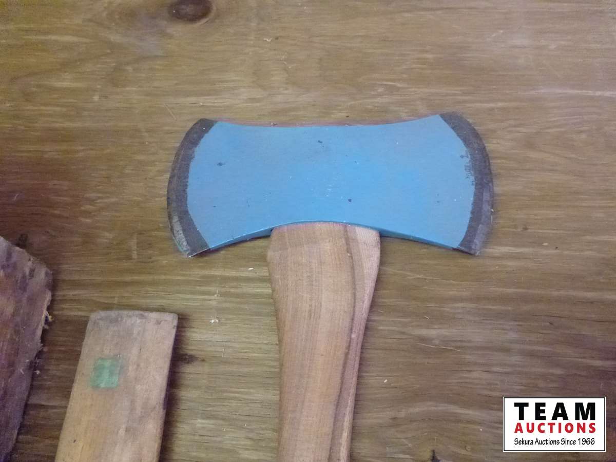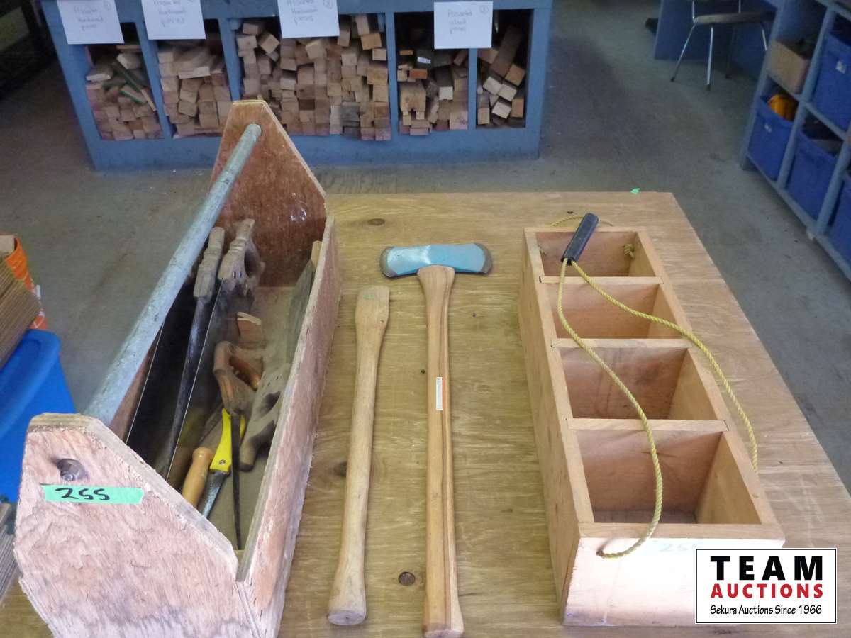 Wood carpentry tool box, variety of hand saws, wood compartment bin, double edged axe, axe handle