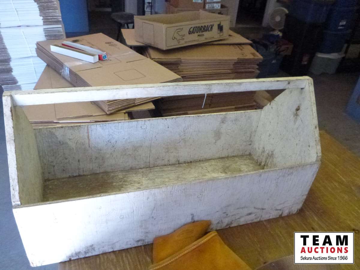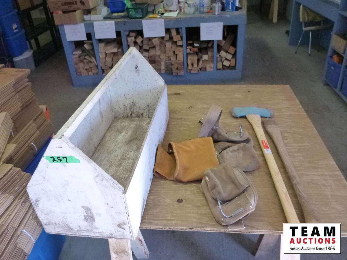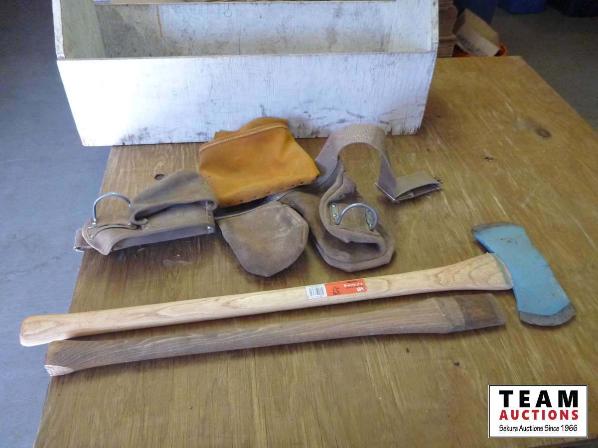 Double head axe, axe handle, wooden carpenters tool box, (2) carpenters belts