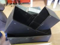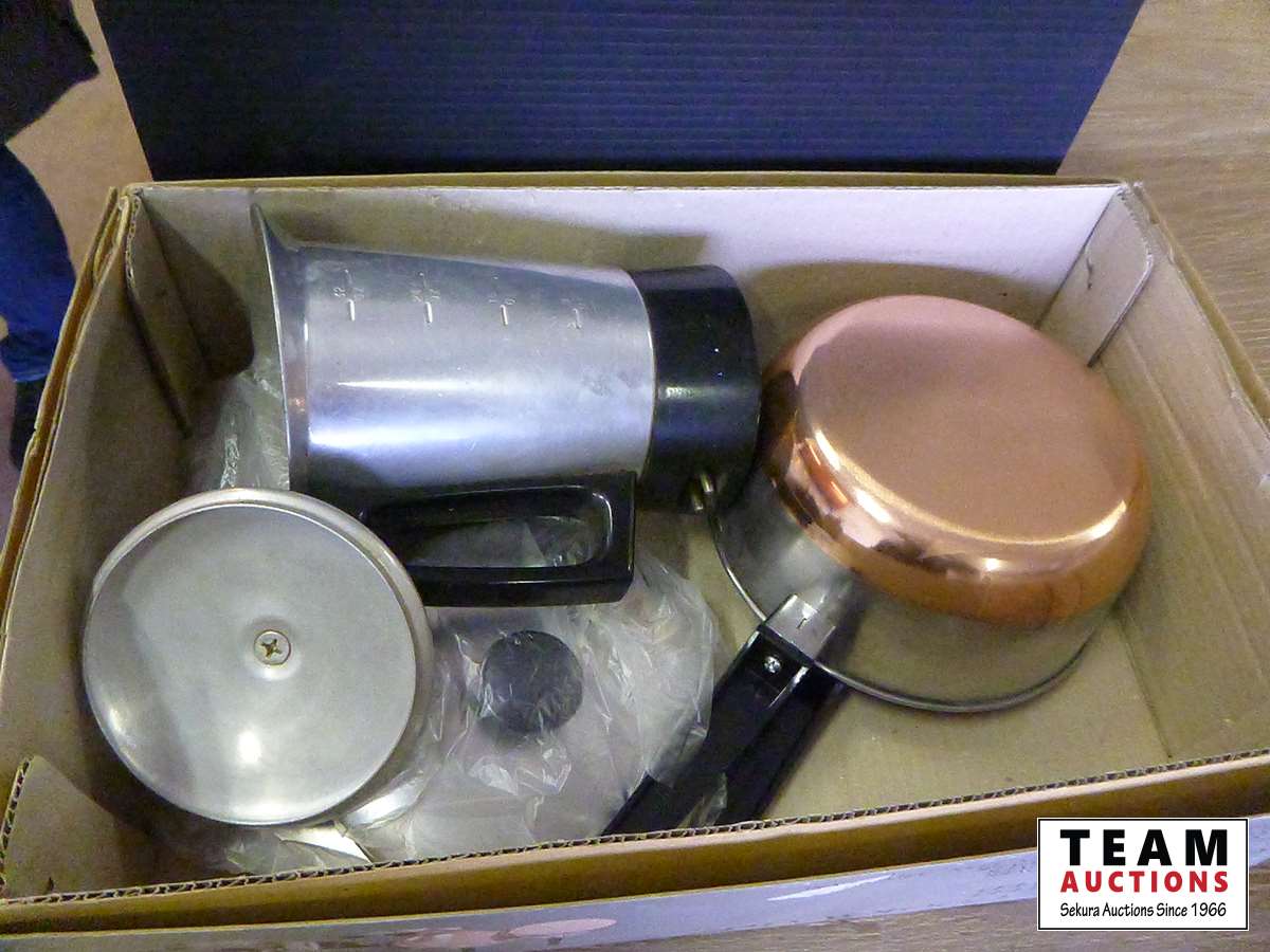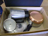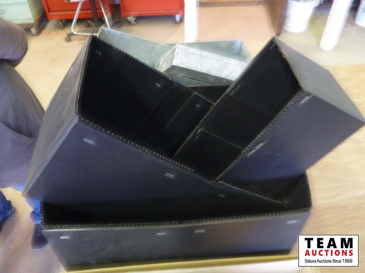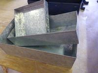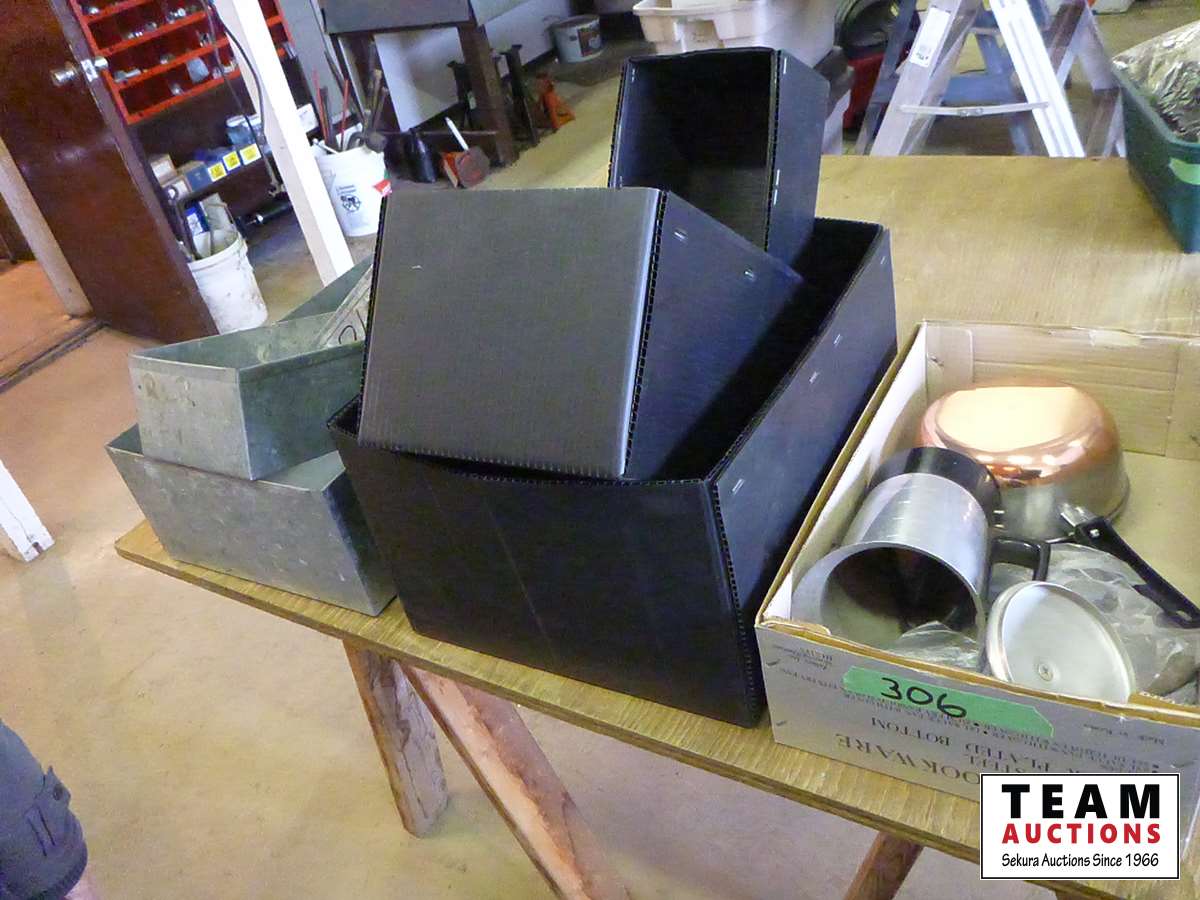 (3) galvanized container trays, (3) coraplast boxes, coffee pot, (2) cooking pots