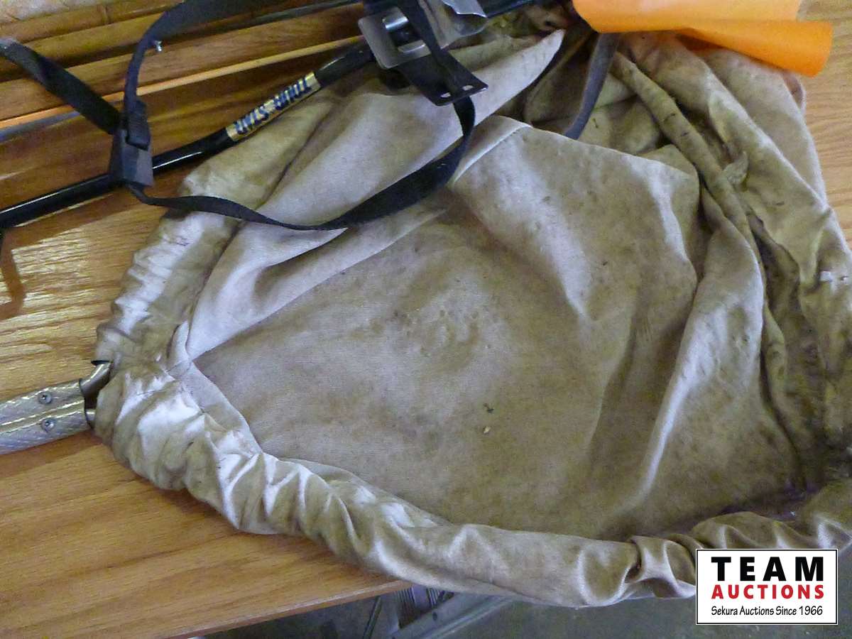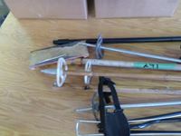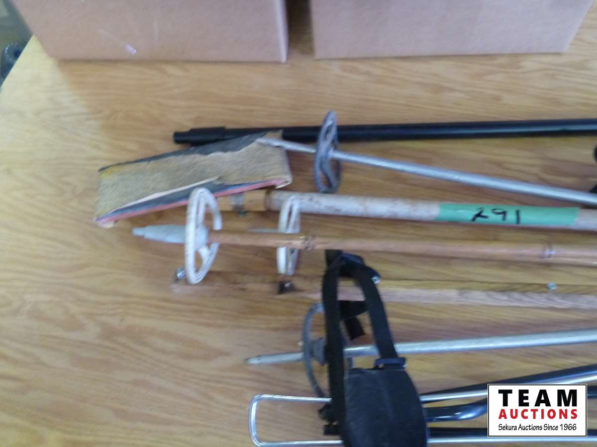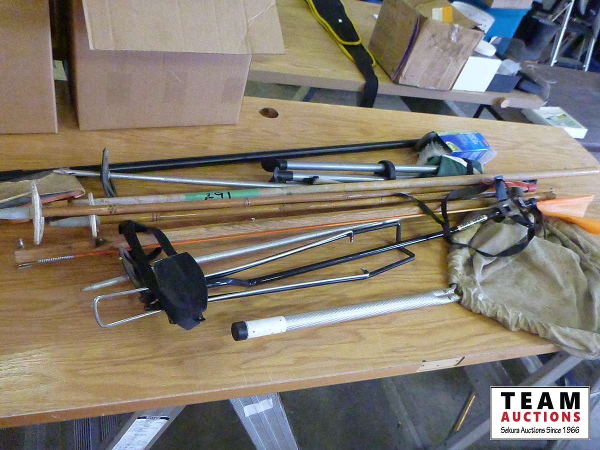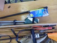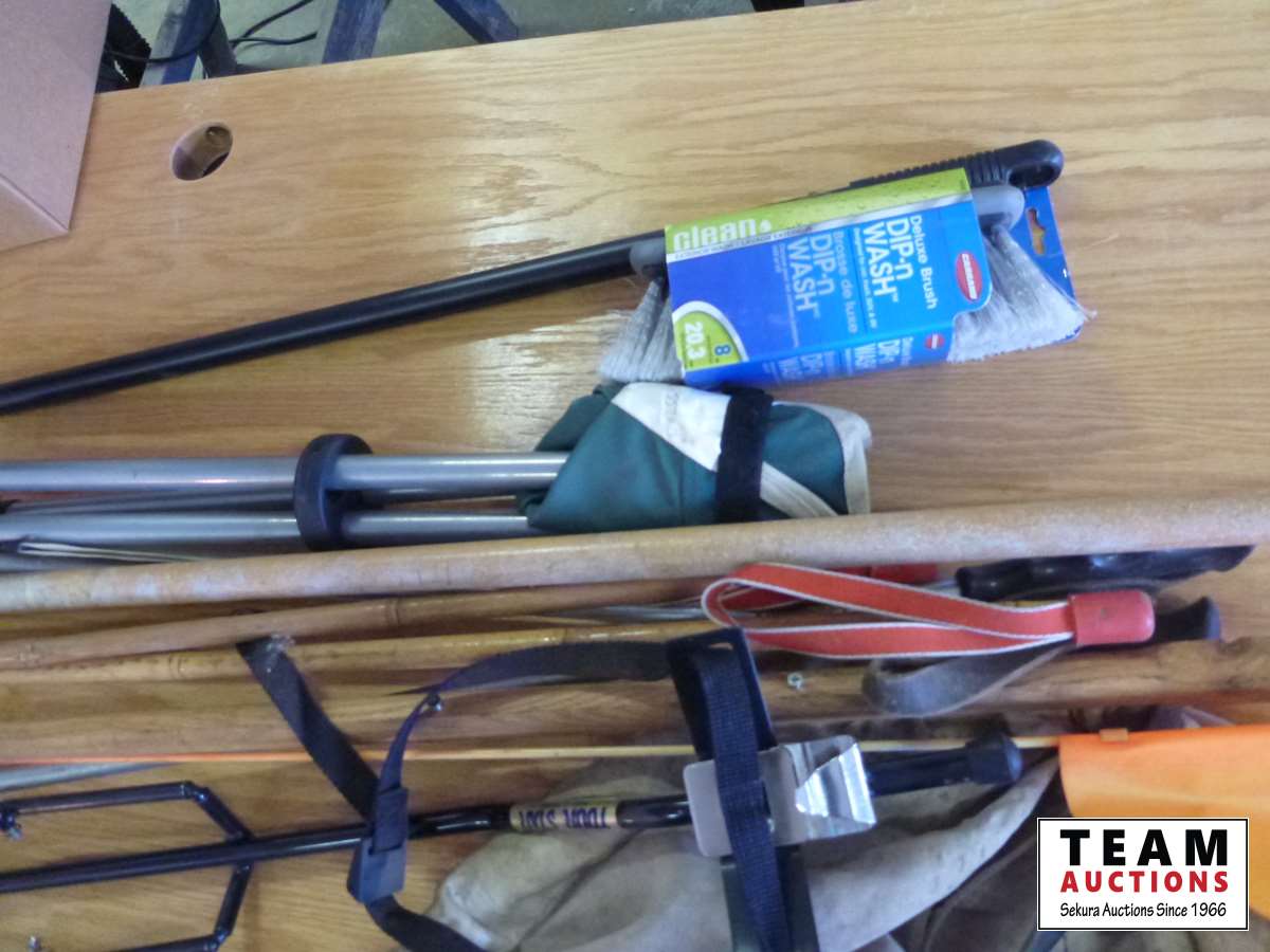 Ski poles, golf bag holder, portable folding stool, bug net, washing broom