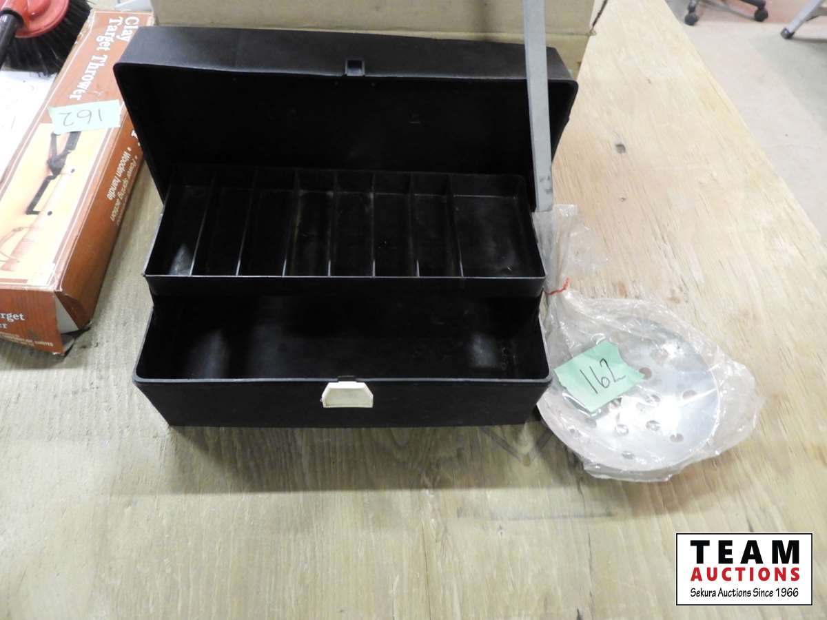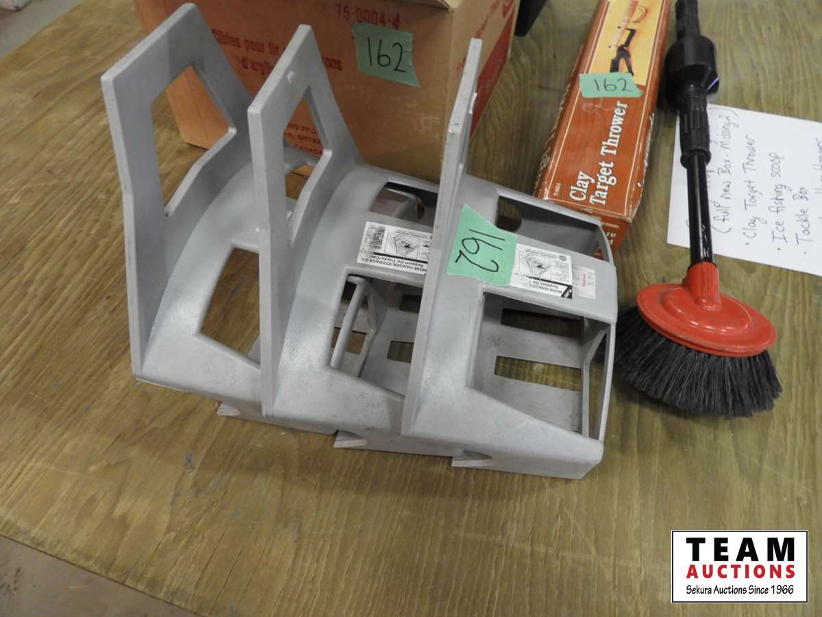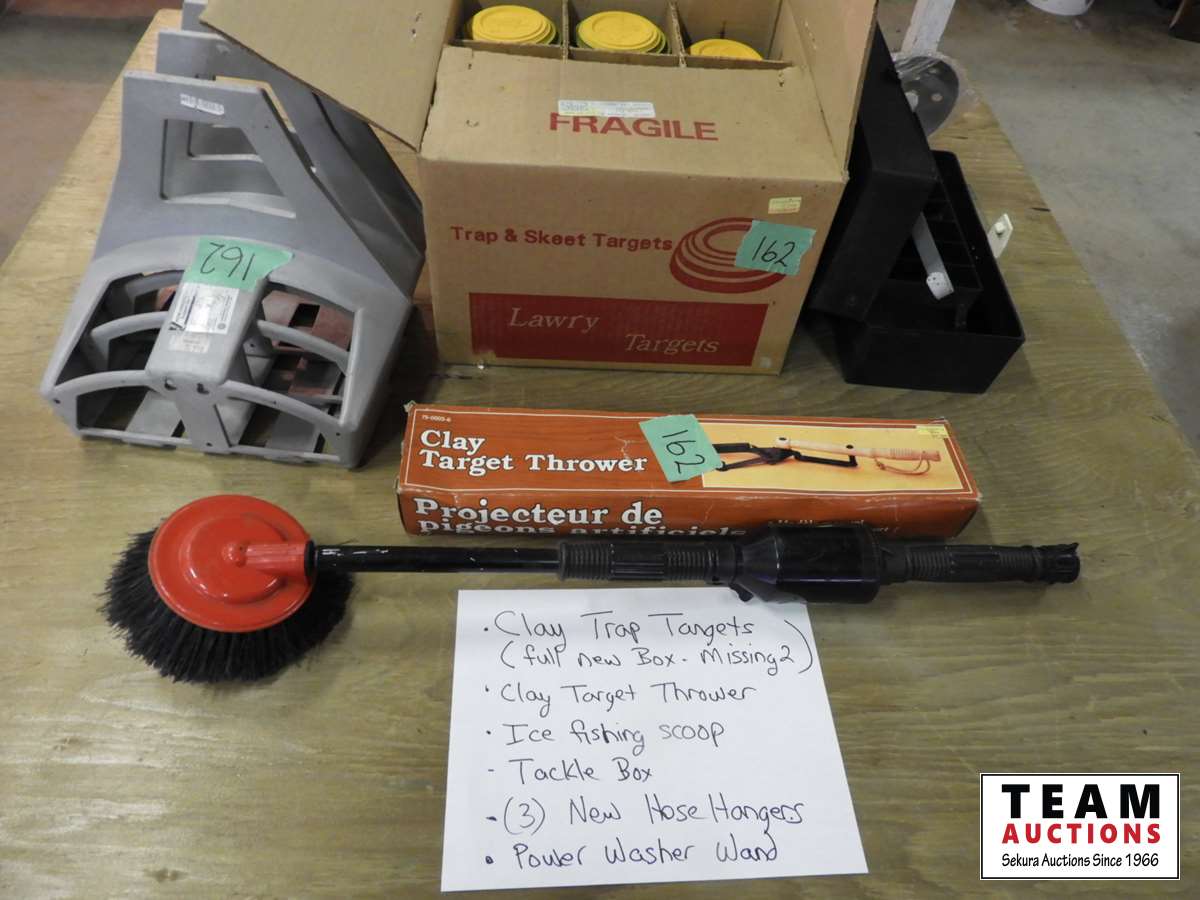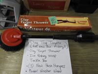 Clay trap targets (full box les 2), clay trap thrower, ice fishing scoop, tackle box, (3) hose hangers, power wash wand with brush