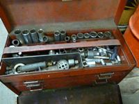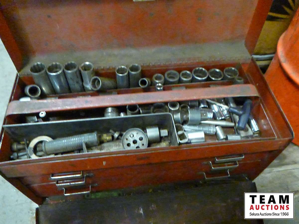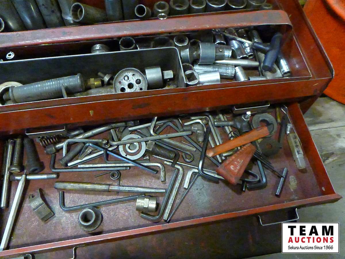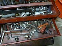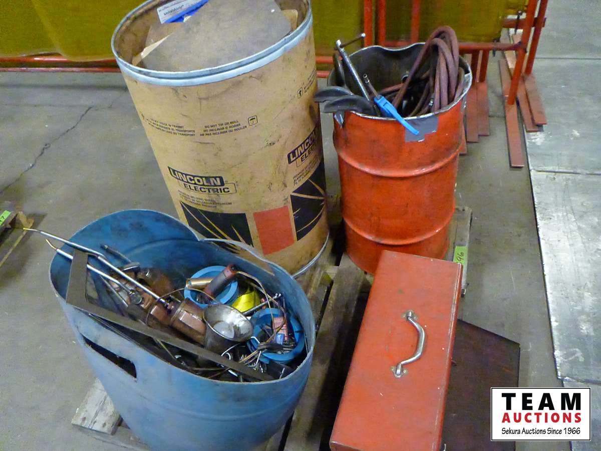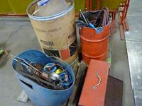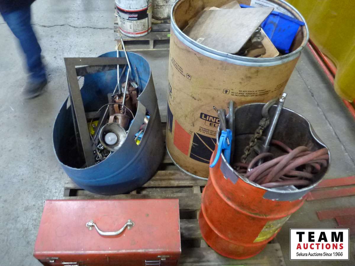 Oil cans, tool box with tools, air hose, C clamps, parts bins, clip boards, miscellaneous items