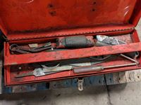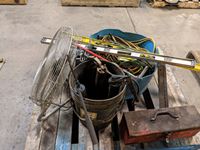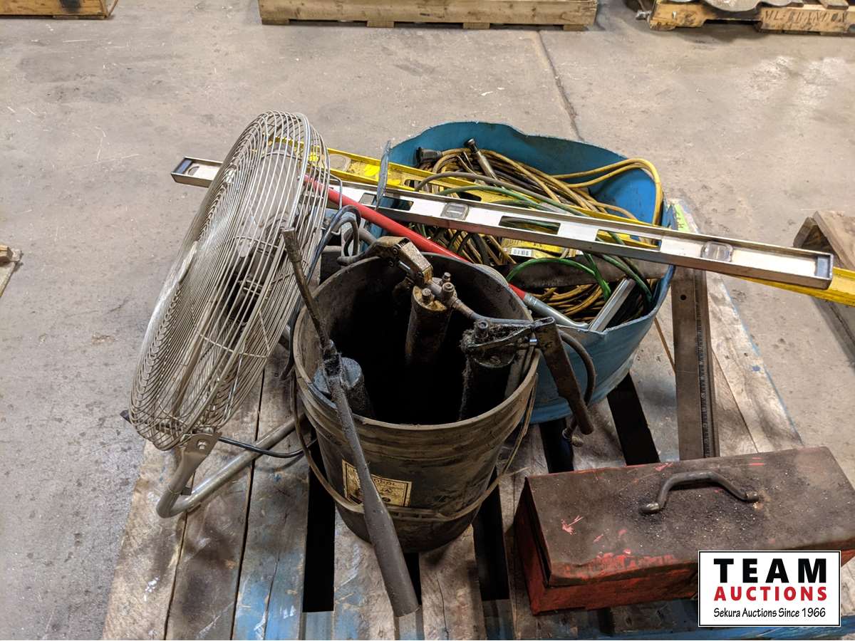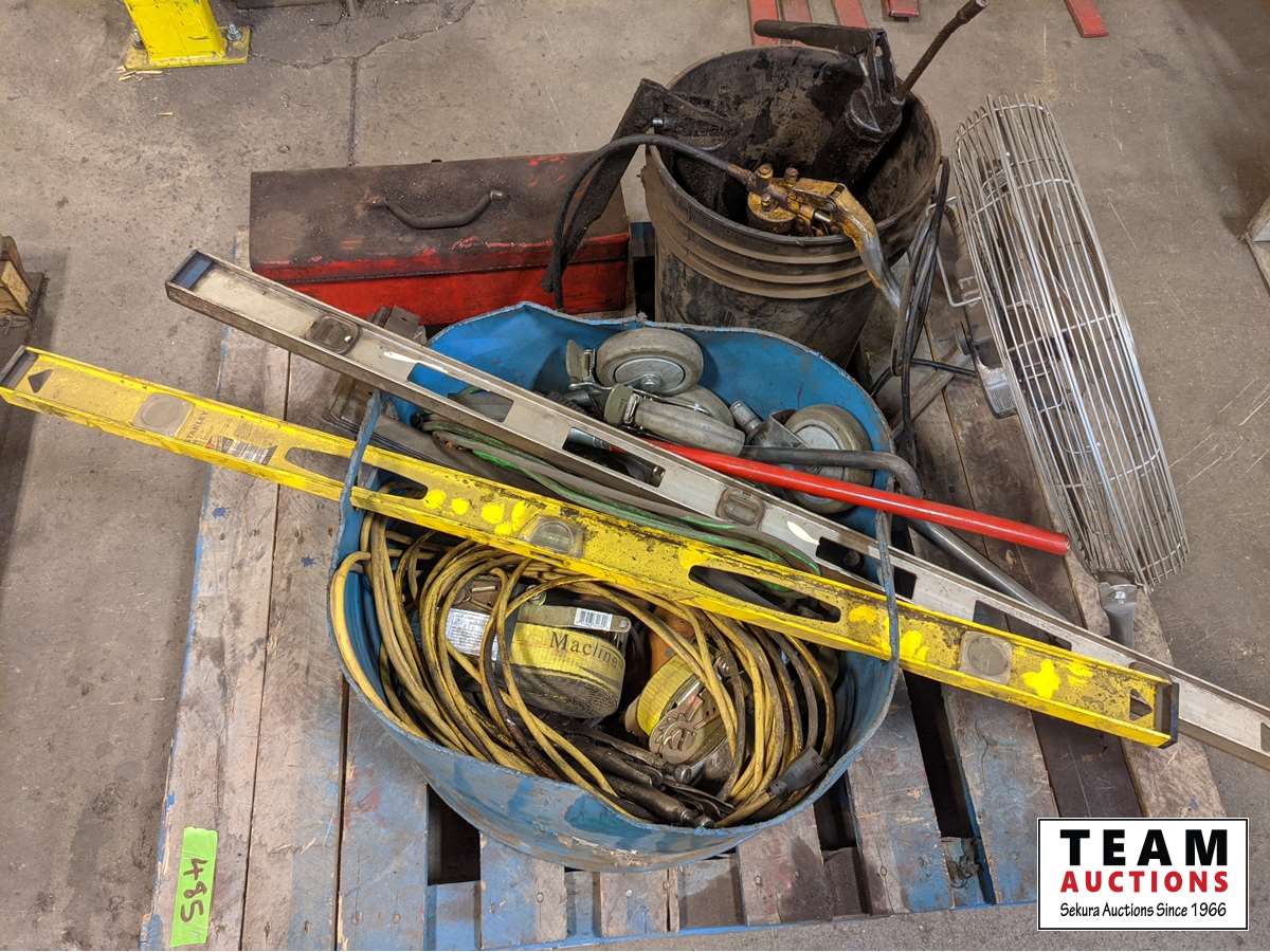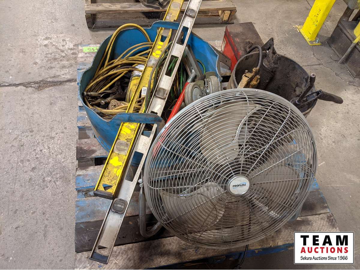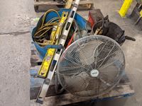 Fan, ratchet straps, levels, extension cord, castors, tool box with tools