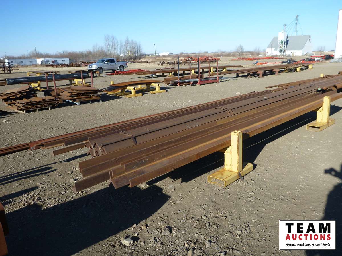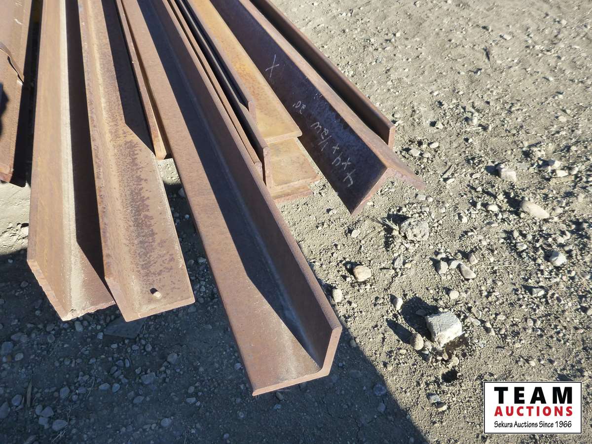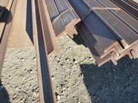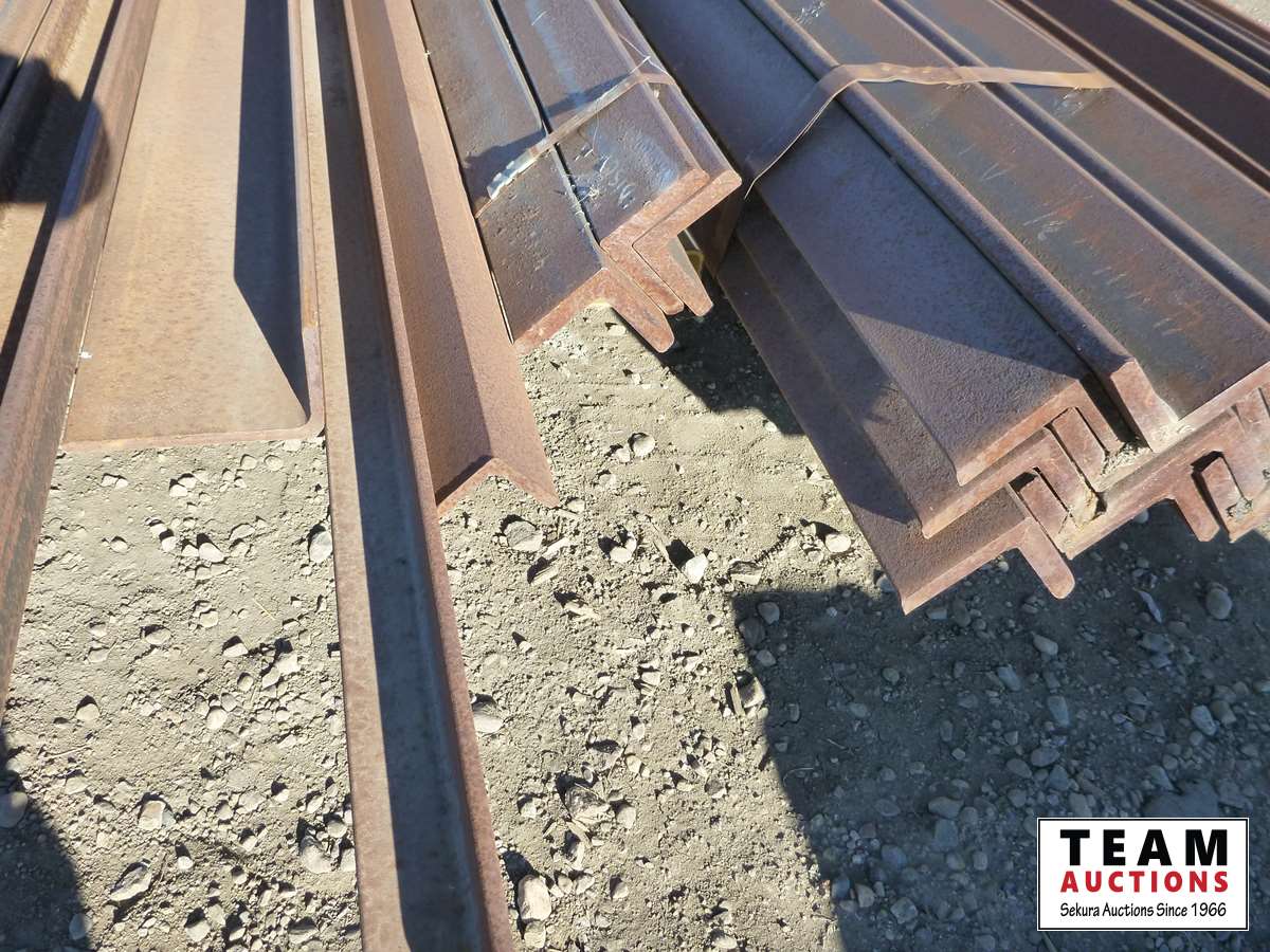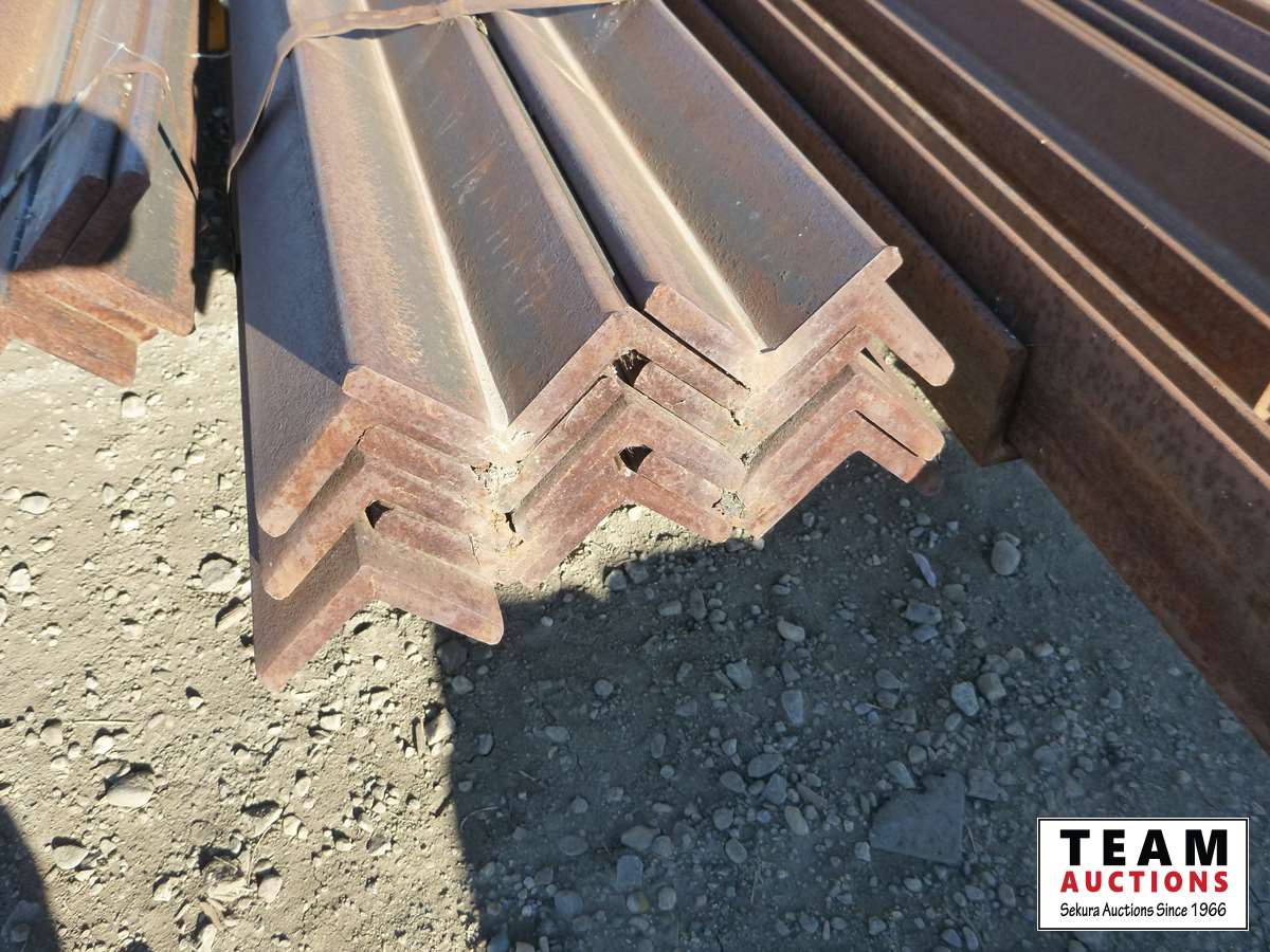 (18) 5/8 ft X 4 inch X 20 ft angle iron, (9) 1/2 inch X 4 inch X 20 ft angle iron, qty of other sizes of angle iron