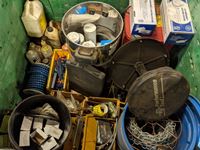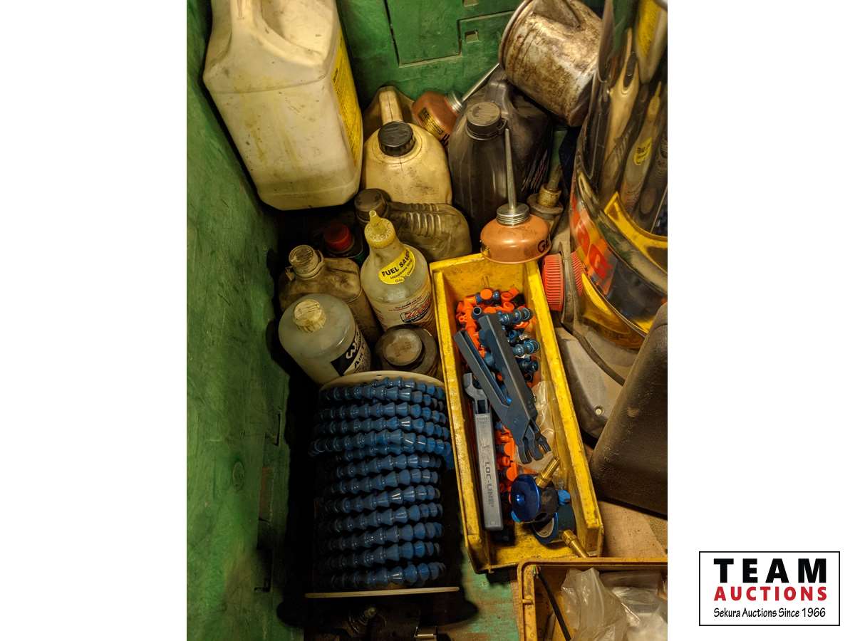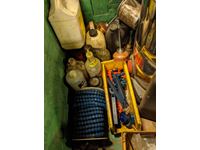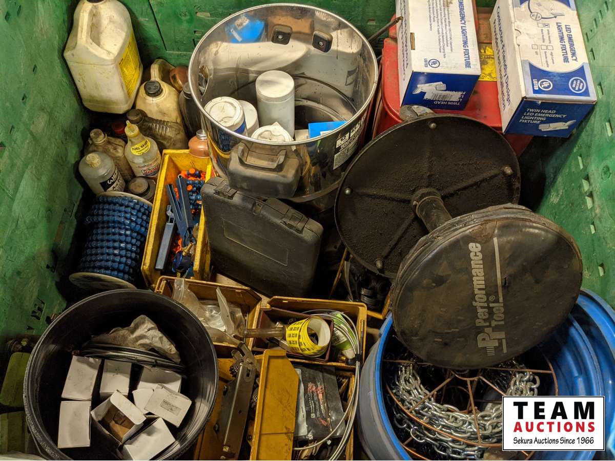 Shop fluids, chain, hardware, mechanics stool, emergency light fixtures, oiling cans