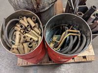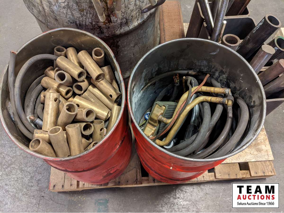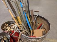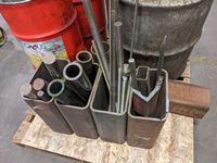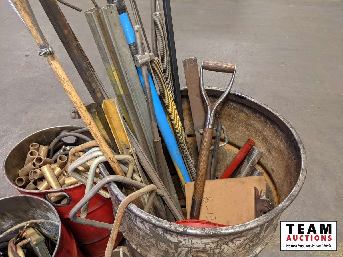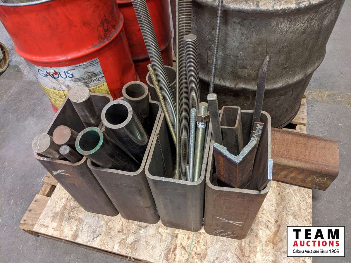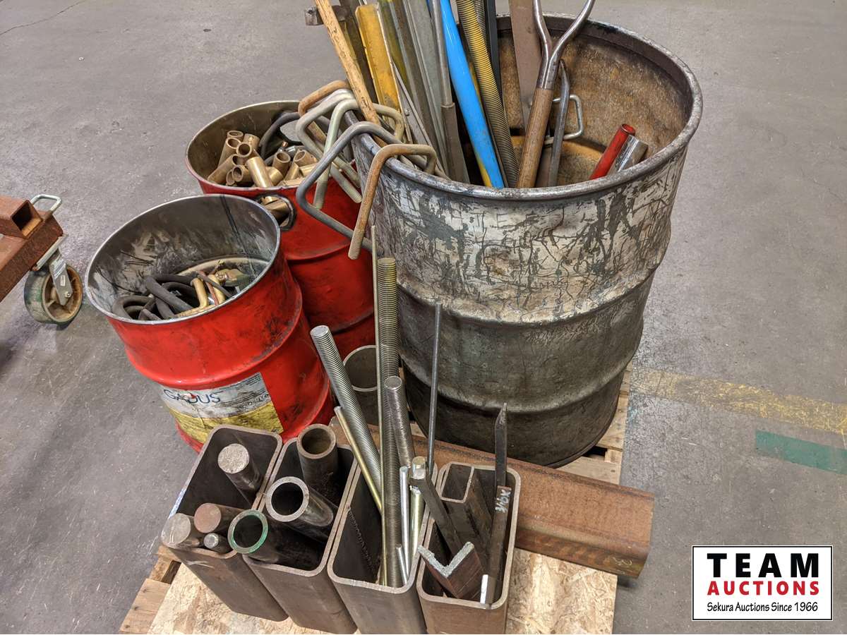 Various sizes of ready rod & steel, shop tools, brass bushings, welding cable, broom, shovel