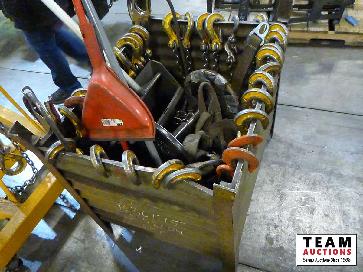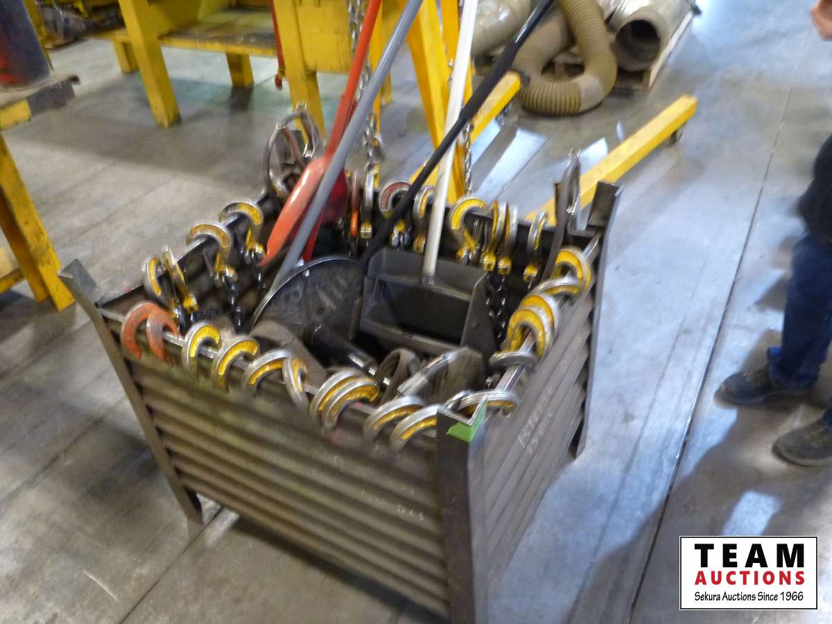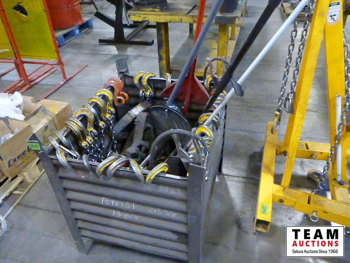 225 Steel Box of Lifting Chains, Mechanic's Stool, Dust Pan & Brooms