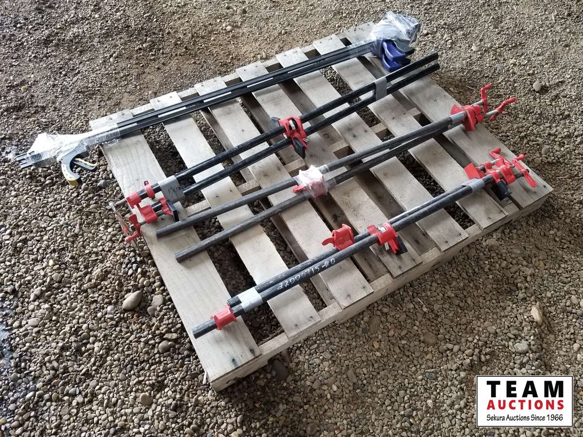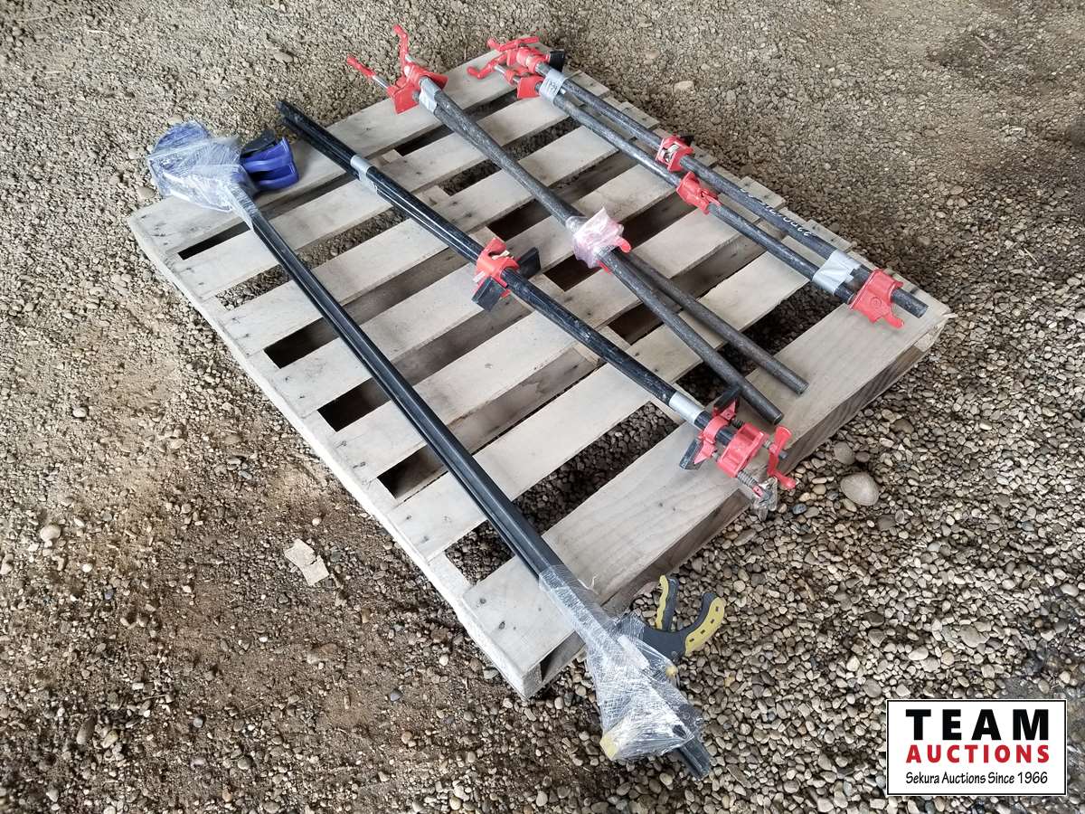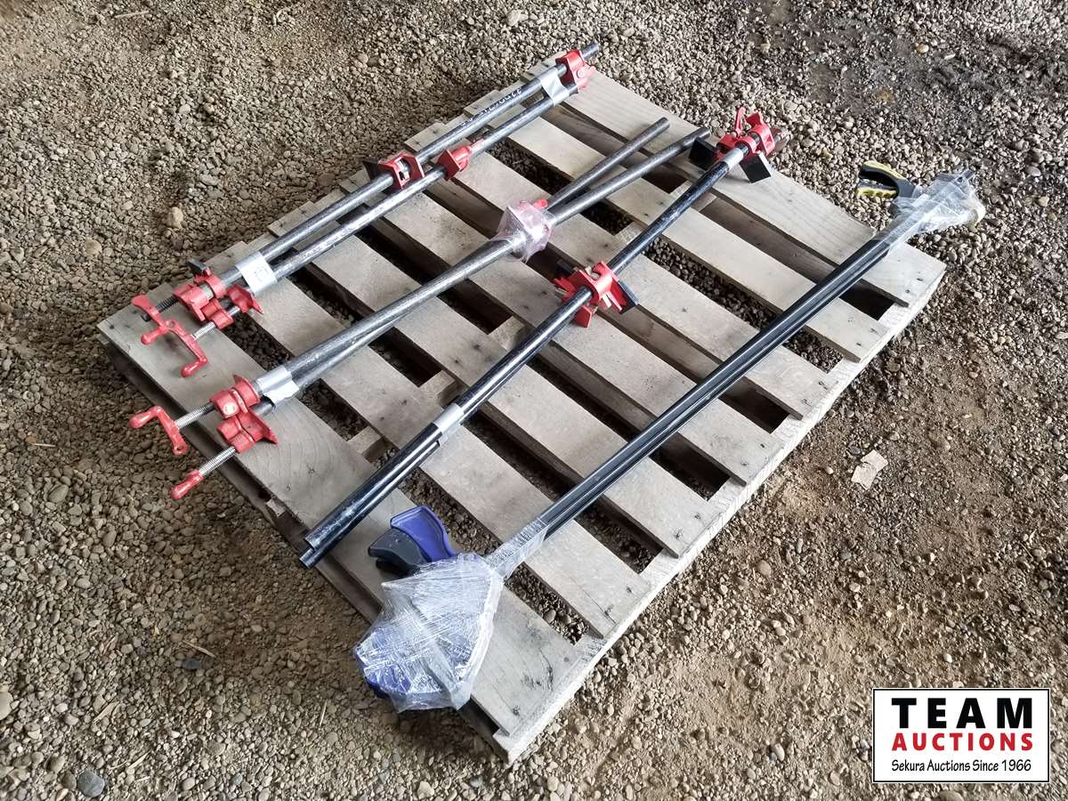 (3) sets of 1 inch x 40 pipe clamps, (2) Irwin 4 ft bar clamps