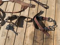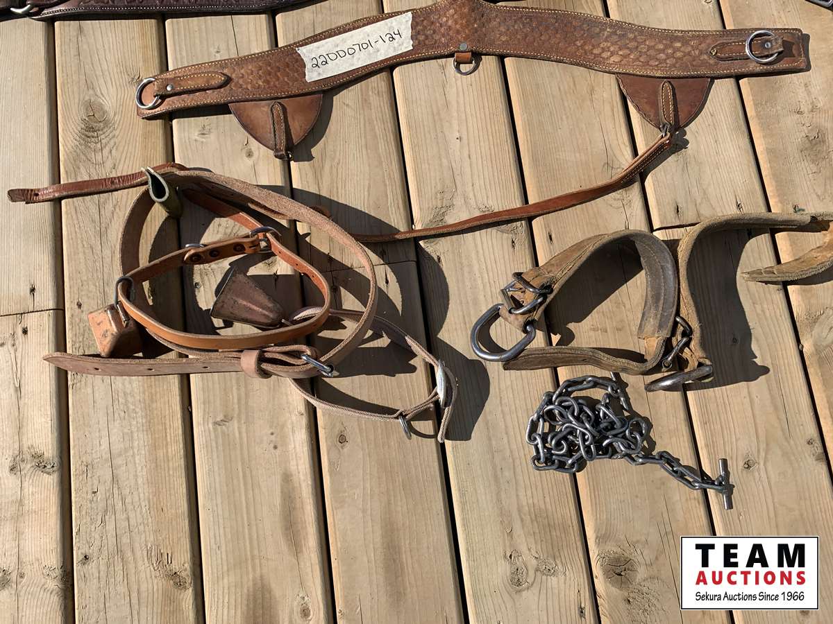 (2) sets of leather hobbles, bells, set of chain hobbles & (2) breast collars