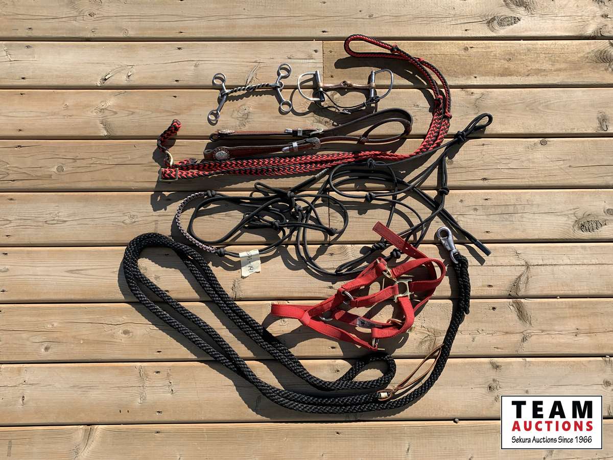 (2) rope halters, halter, one ear headstall, set of single reins, lead rope, D ring snaffle with chin strap, twisted wire snaffle shank bit