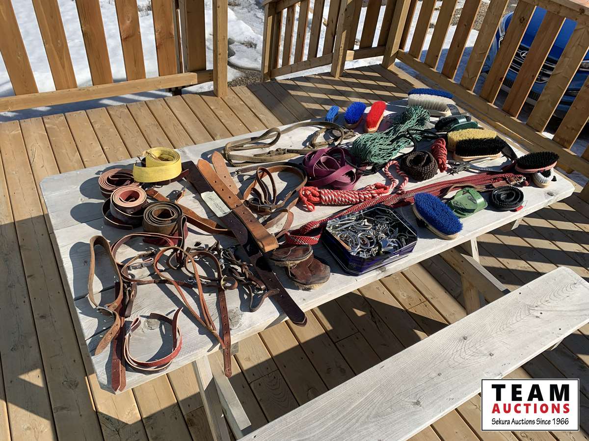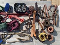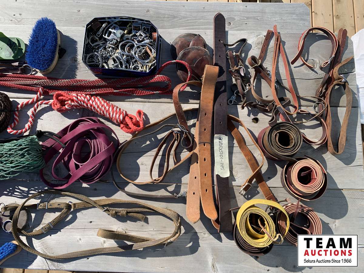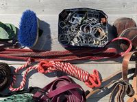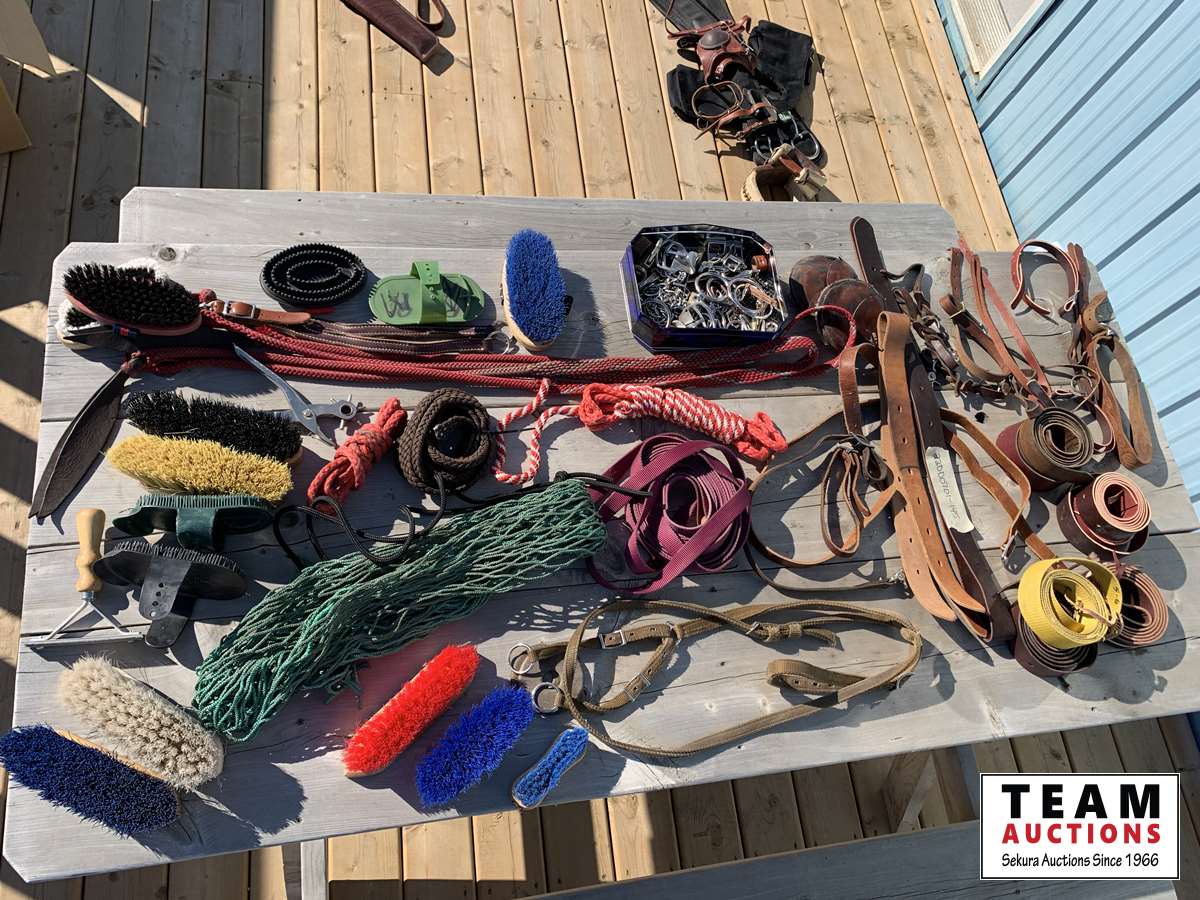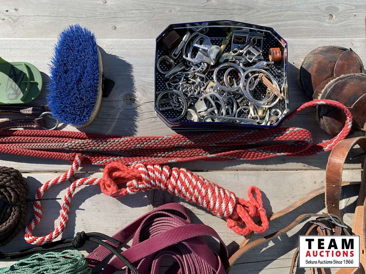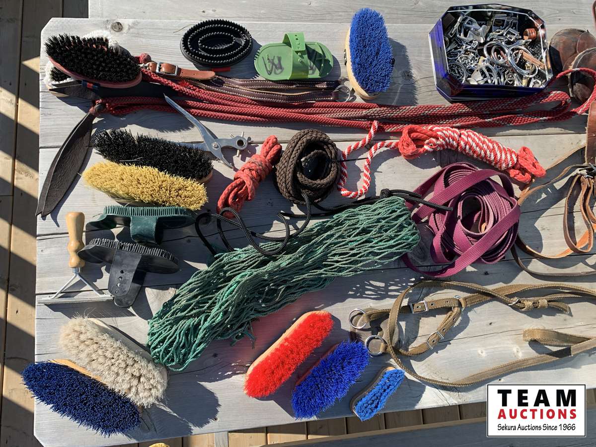 Brushes, leather straps, reins, feed bag, buckles, clips, lead rope