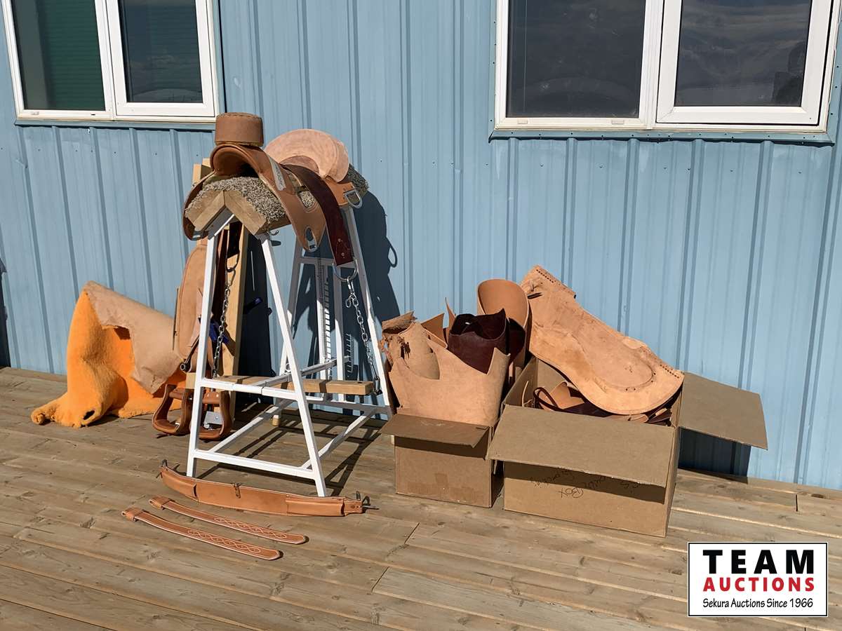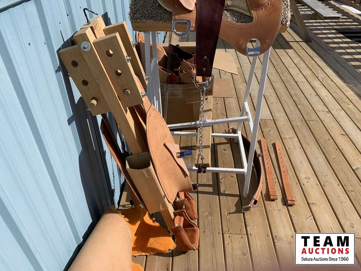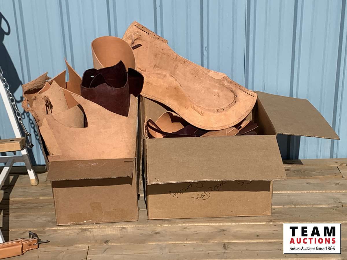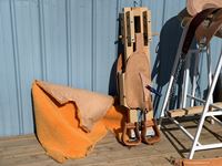 (2) stirrups, back cinch, (2) back billets, (2) boxes of left over leather