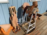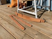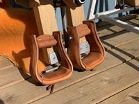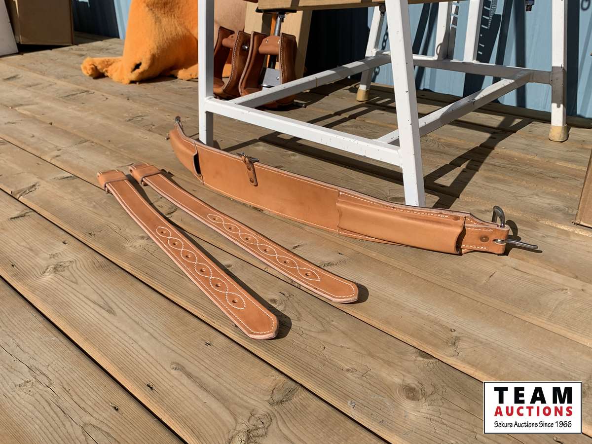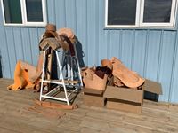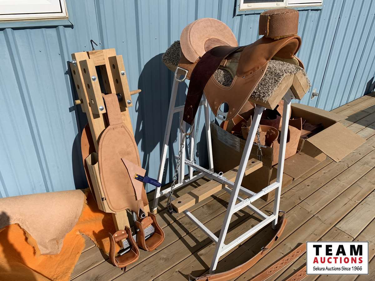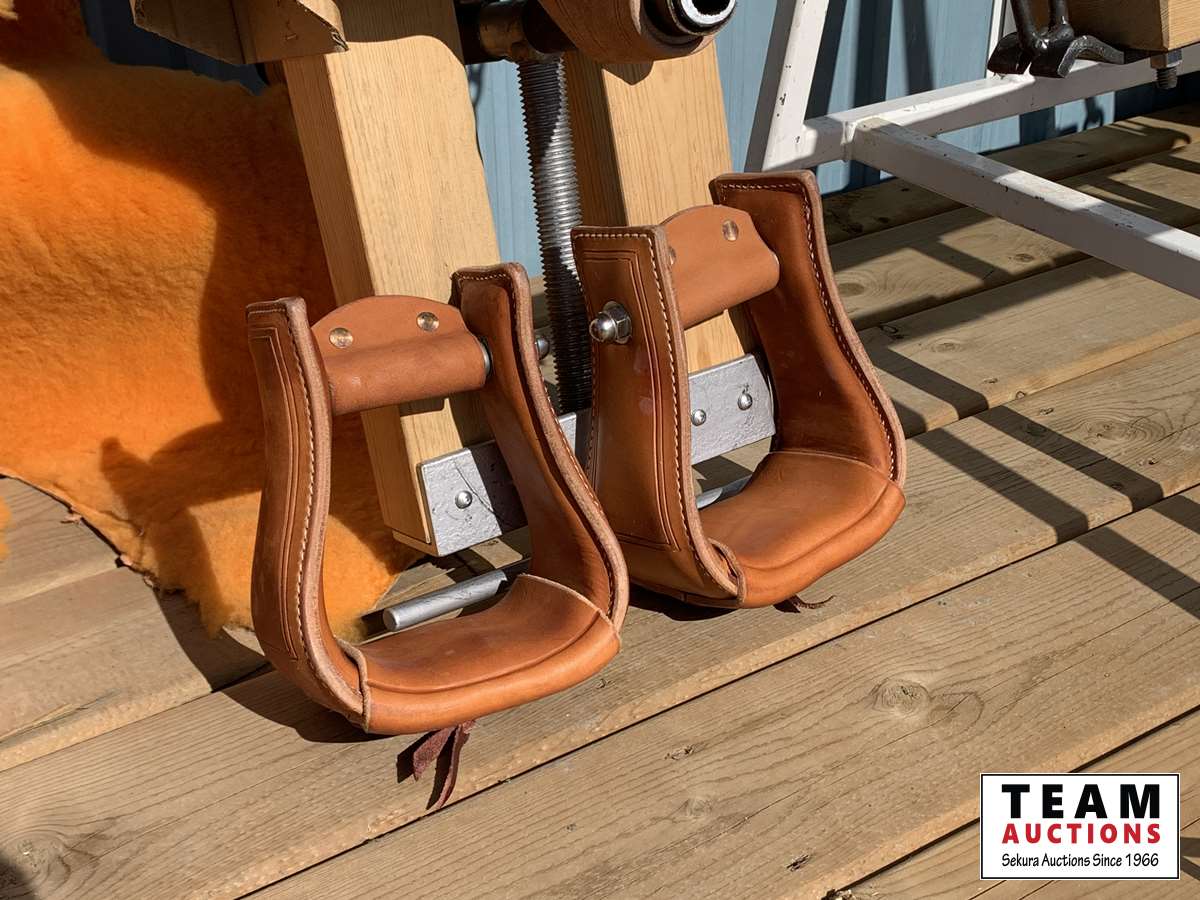 (2) stirrups, back cinch, (2) back billets, (2) boxes of left over leather