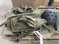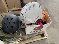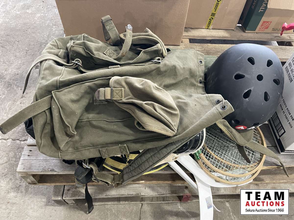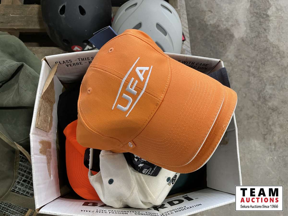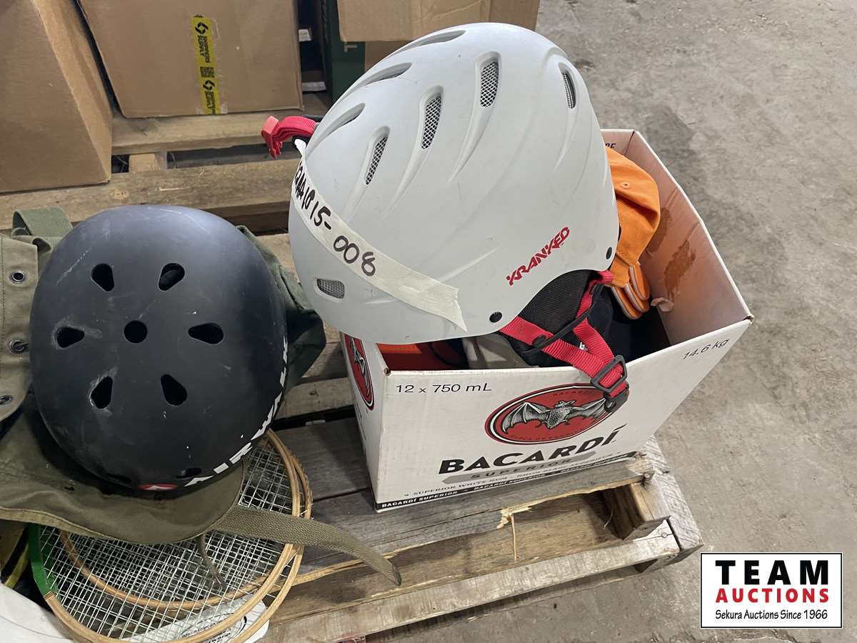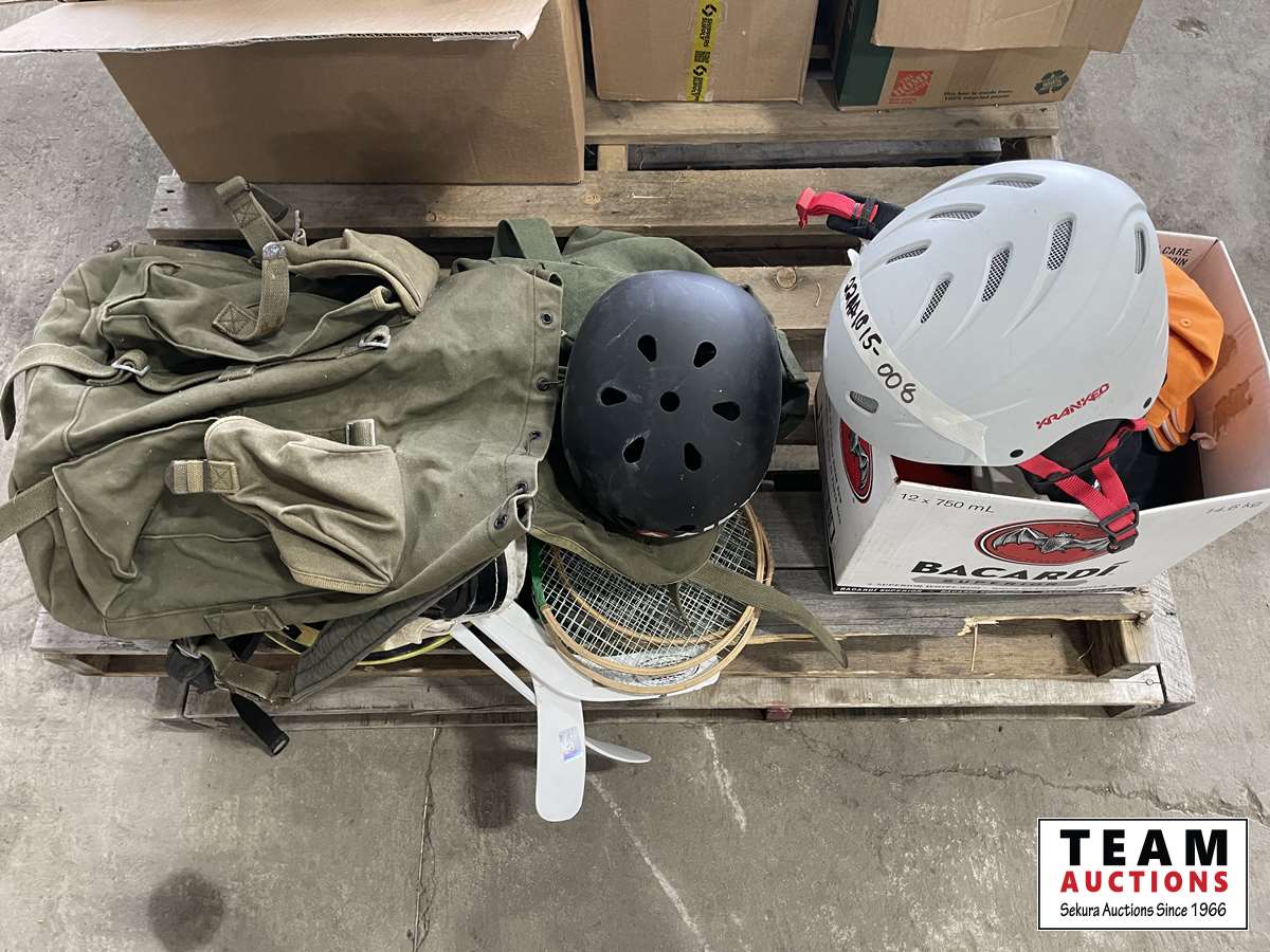 Back packs, helmets, hats, mini sticks