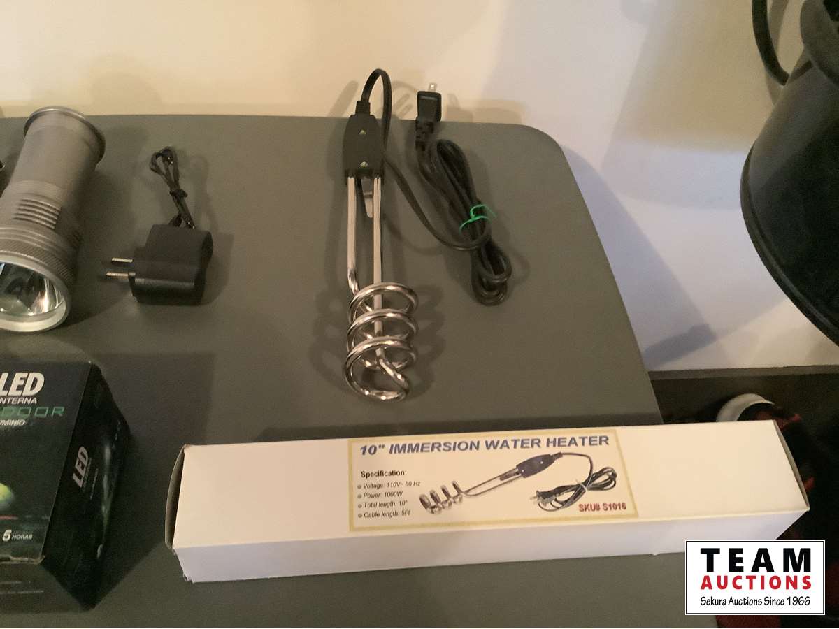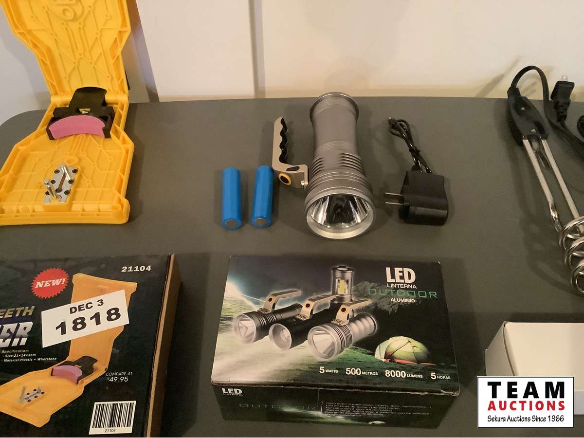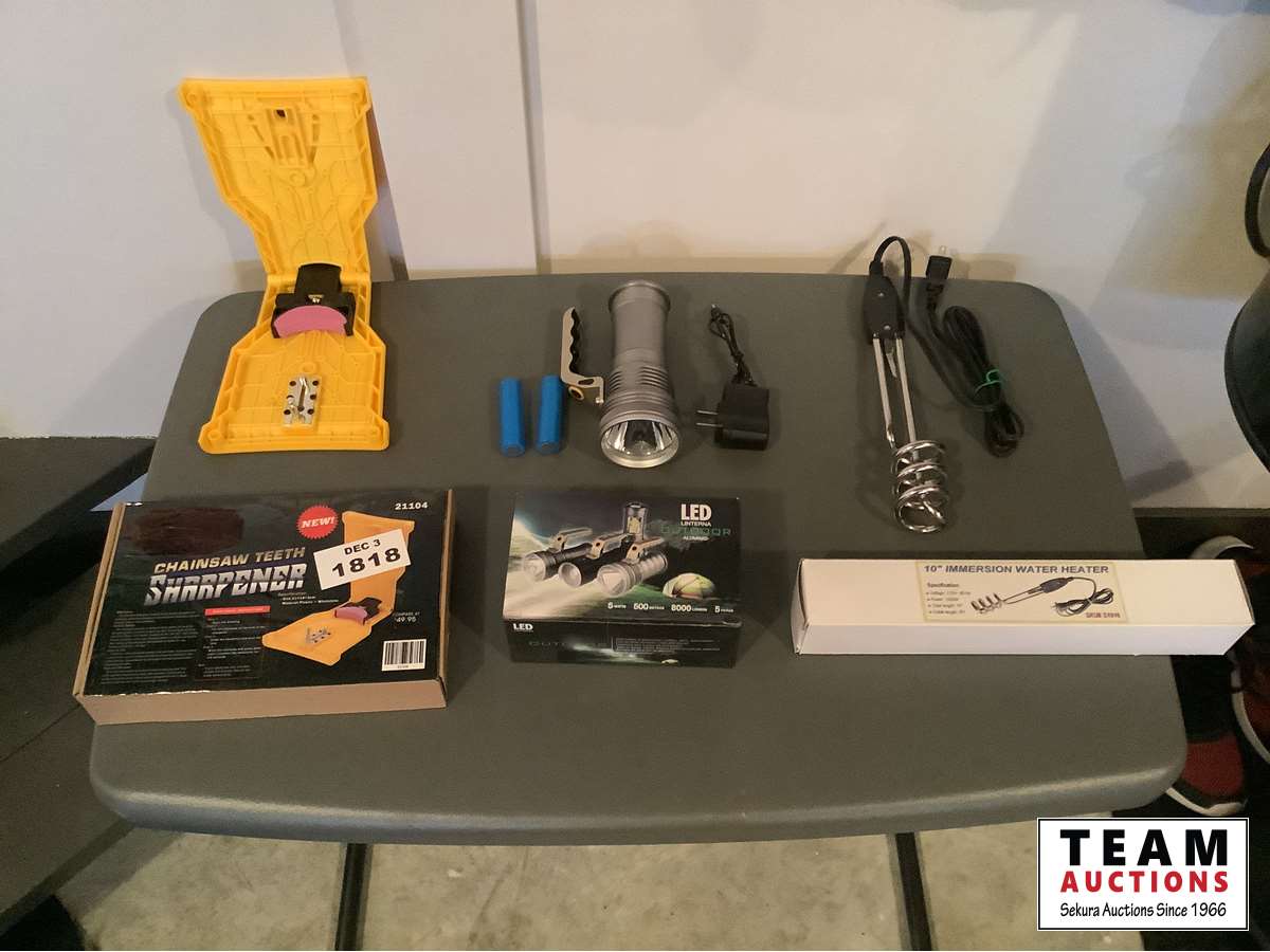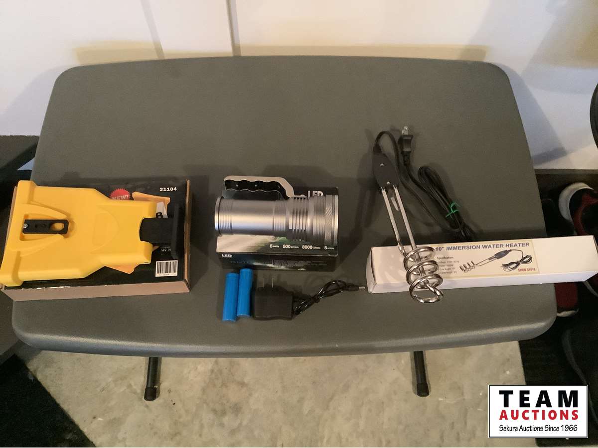 1337 Chain Saw Sharpener, LED Rechargeable Flashlight & 120 Volt Water Heater (Unused)
