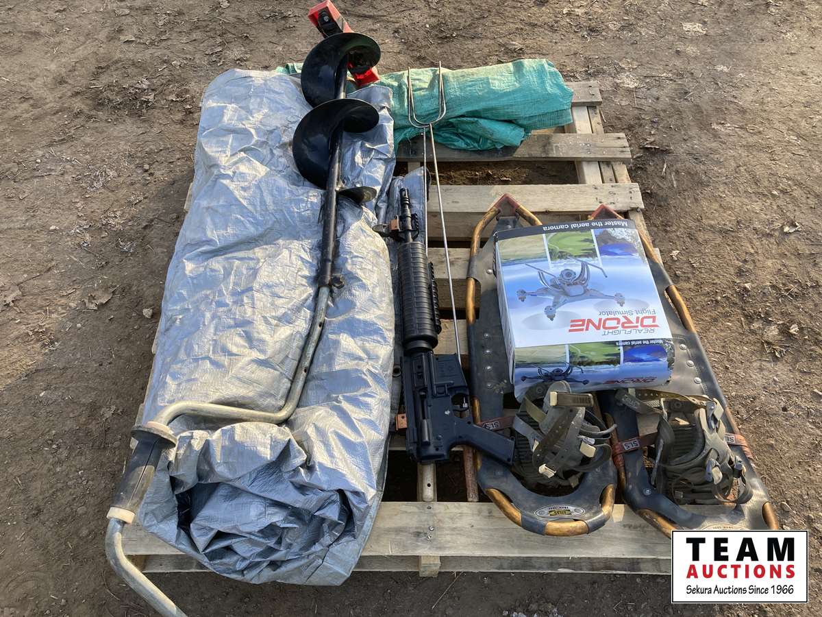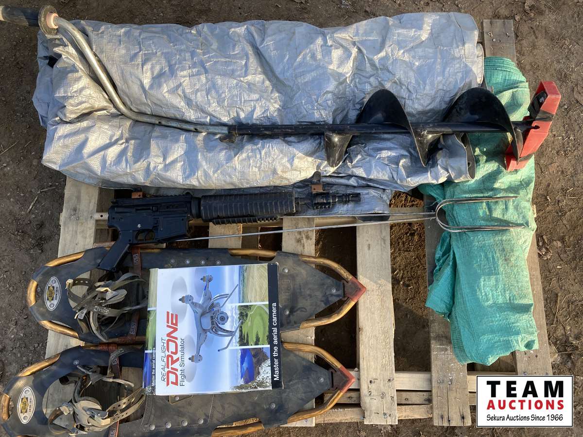 Tarps, ice auger, soft air gun, weiner sticks, snowshoes, drone, simulator