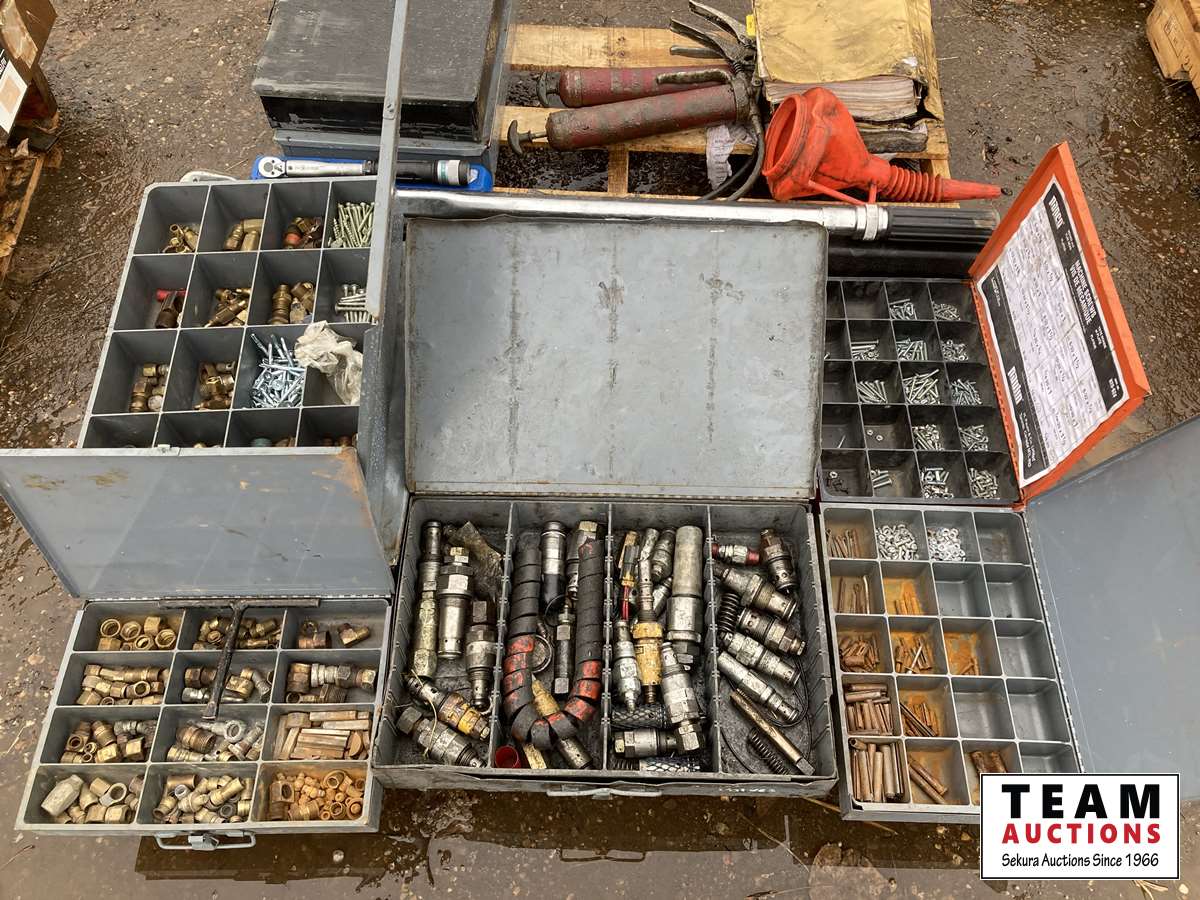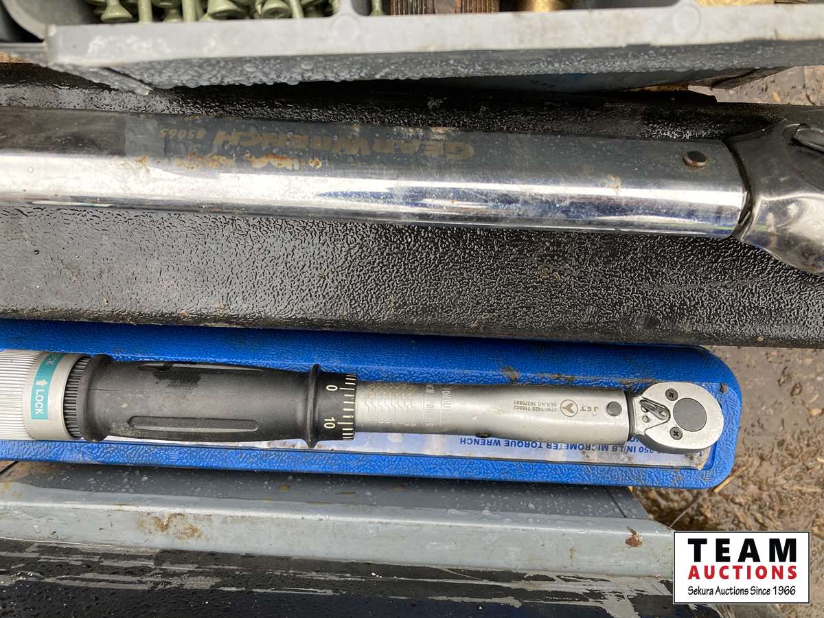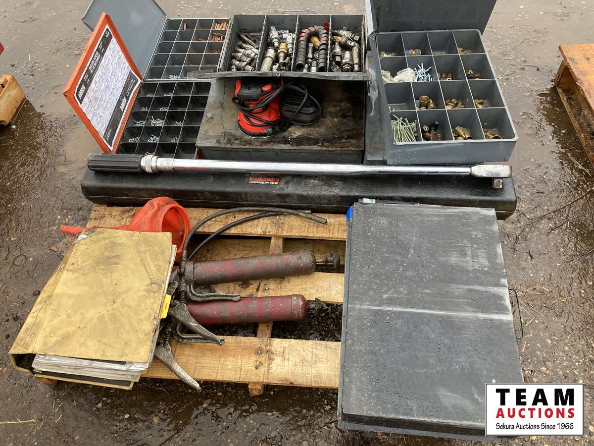 Grease guns, cat manual, 3/4 inch torque wrench, palm sander, fittings, screws, funnel Jet, 1/4 drive torque wrench