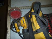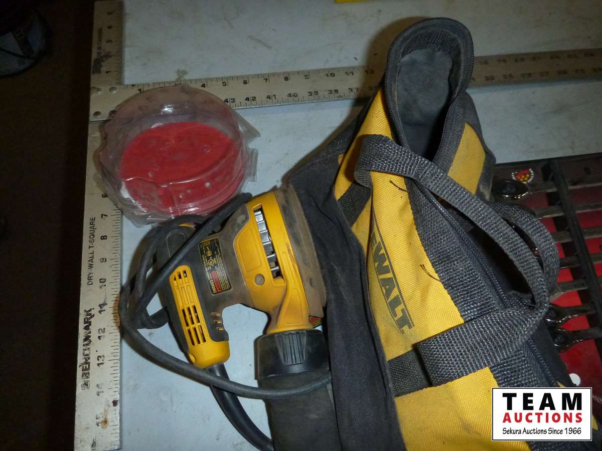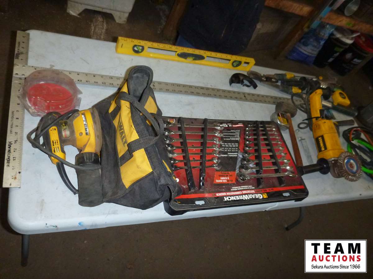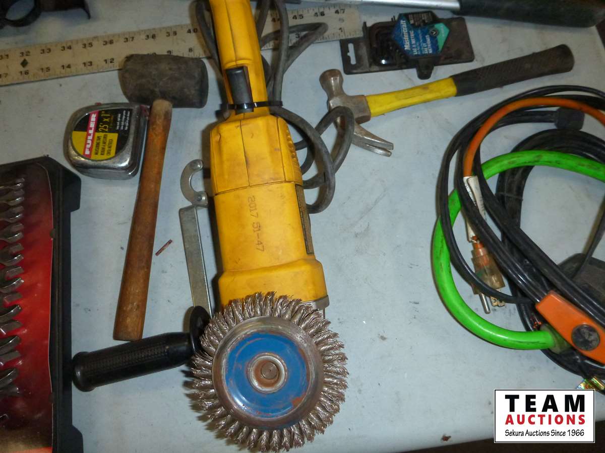 Tool kit complete, DeWalt palm sander, T square, level, pruning loppers, flashlight, tape measure, rubber mallet, claw hammer, DeWalt angle grinder, Allan key assortment, extension cord
