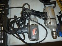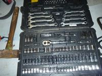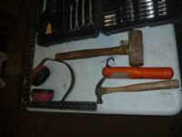 hammer, safety face shield, light, 1/2" Makita angle grinder, pry bar, wood drill bis, level, drill, 1/2" electric impact, ratcheting wrench set, ear protection muffs