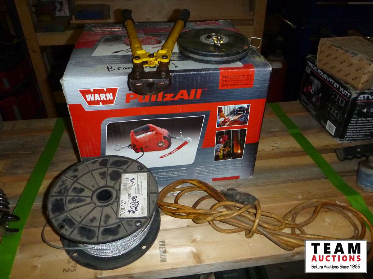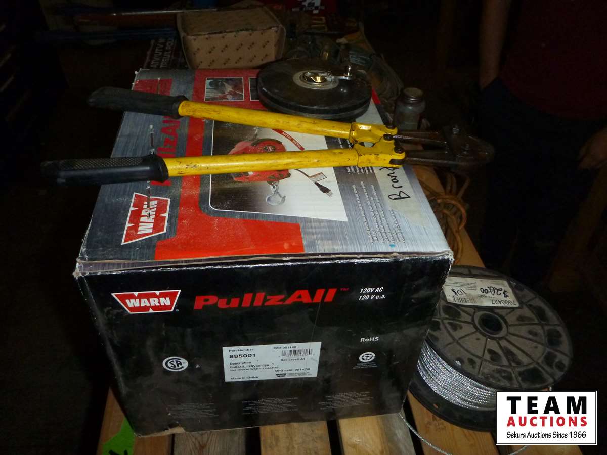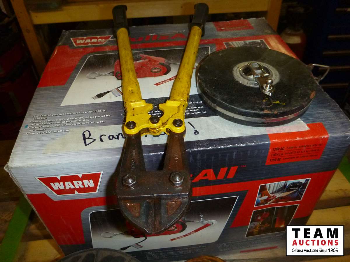 Extension cord, long tape measure, Warn 110 volt electric winch, bolt cutters